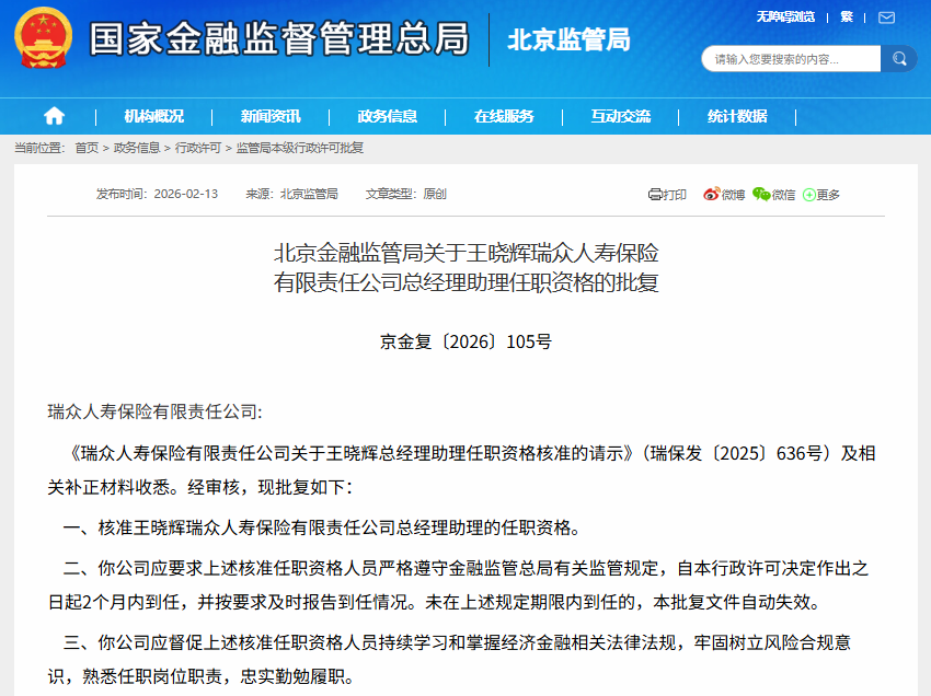 2月13日,据北京金融监管局网站,王晓辉获批担任瑞众人寿总经理助理。 关键词阅读:瑞众人寿 责任编辑:栎树 ...