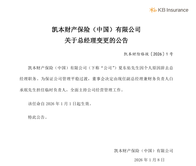 凯本财险总经理夏东佑辞任,副总白承珉出任临时负责人