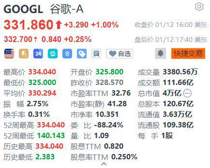 | GOOGL 谷歌-A | | | | --- | --- | --- | | 331.860 1 +3.290 +1.00% | | 收盘价 01/12 16:00 美东 | | 332.700+ 0.840 +0.25% | | 盘后价 01/12 17:40 美东 | | 二 2 24 4 8 日 ♥自选 | | ● 快捷交易 | | 最高价 334.040 | 开盘价 325.800 | 成交景 3380.56万 | | 最低价 325.000 | 昨收价 328.570 | 成交额 111.66亿 | | 平均价 330.294 | 市空室 [M 32.76 | 总市值 4万亿 (--) | | 振 幅 2.75% | 市盈率(台) 41.28 | 总股本 120.67亿 | | 换手率 0.31% | 市海率 10851 | 流通值 3.63万亿 | | 52周最高 334.040 委 比 -88.24% | | 流通股 109.38亿 | | 52周最低 140.143 | 量 比 1.09 | 每 手 1股 | | 历史最高 334.040 股息TTM 0.820 | | | | 股息率IT ...