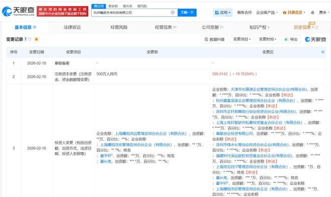 Core Viewpoint - Hangzhou Xinuo Future Technology Co., Ltd. has undergone a business change, adding new shareholders including Xiaomi's Huanxing Venture Capital and CATL's Fujian Times Zeyuan Equity Investment Fund, while increasing its registered capital from 5 million RMB to approximately 5.988 million RMB [1]. Company Information - Hangzhou Xinuo Future Technology Co., Ltd. was established on December 24, 2024, with Xia Yuxuan as the legal representative. The company focuses on the research and development, sales, and manufacturing of intelligent robots, particularly in the humanoid robot sector [1][2]. - The company is identified as a core component supplier in the humanoid robot field, indicating its strategic position within the robotics industry [1]. Shareholder Structure - The current shareholders include Xia Changliang, Xia Yuxuan, and the newly added shareholders, which reflect a diversified investment base [1]. - The new shareholders include significant players in the technology and energy sectors, which may enhance the company's growth potential and market reach [1].