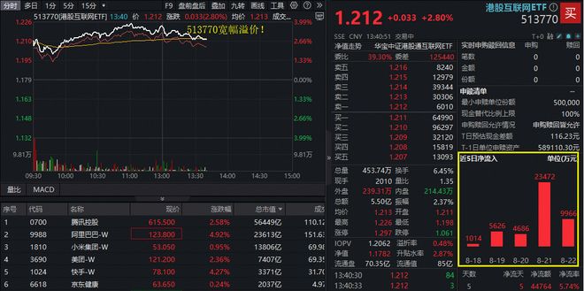 ETF盘中资讯 降息预期叠加业绩兑现,港股互联网巨头强势,阿里大涨5%!513770上探4%创历史新高,场内宽幅溢价!