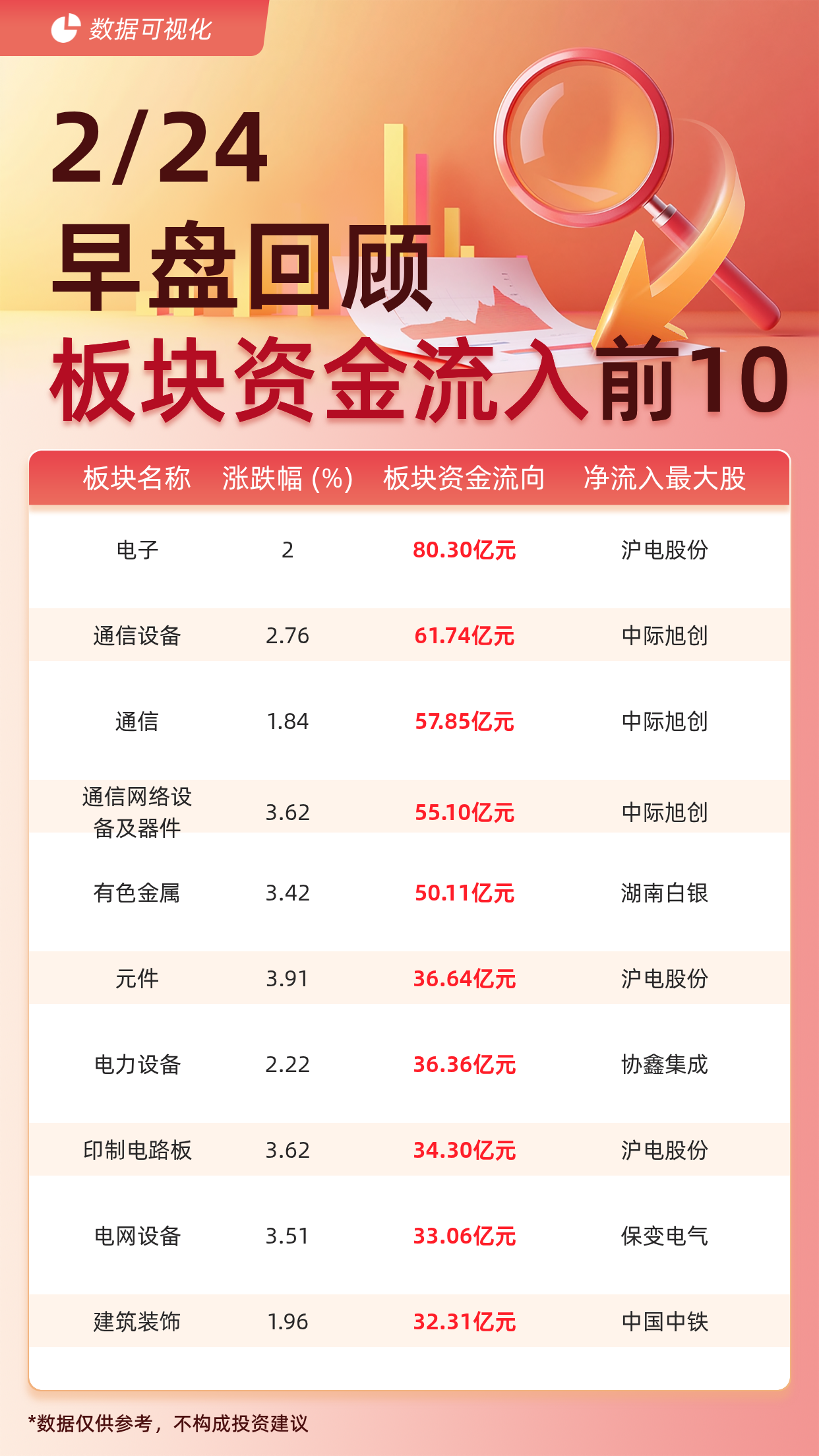据交易所数据显示,截至2月24日午间收盘,大盘主力资金净流入122.98亿元。主力资金流入前十大板块分别为:电子(80.30亿元)、 通信设备(61.74亿 元)、通信(57.85亿元)、通信网络设备及器件(55.10亿元)、 有色金属(50.11亿元)、元件(36.64亿元)、 电力设备(36.36亿元)、印制电路板 (34.30亿元)、 电网设备(33.06亿元)、 建筑装饰(32.31亿元)。 | | 板块名称 涨跌幅 (%) 板块资金流向 | | 净流入最大 | | --- | --- | --- | --- | | 电子 | 2 | 80.30亿元 | 沪电股份 | | 通信设备 | 2.76 | 61.74亿元 | 中际旭创 | | 通信 | 1.84 | 57.85亿元 | 中际旭创 | | 通信网络设 备及器件 | 3.62 | 55.10亿元 | 中际旭创 | | 有色金属 | 3.42 | 50.11亿元 | 湖南白银 | | 元件 | 3.91 | 36.64亿元 | 沪电股份 | | 电力设备 | 2.22 | 36.36亿元 | 协鑫集成 | | --- | --- | --- | ...
