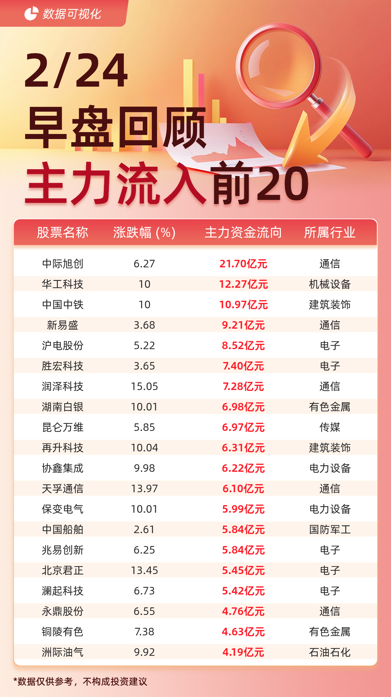 据交易所数据显示,截至2月24日午间收盘,主力资金流入前20的股票分别为: 中际旭创(21.70亿元)、 华工科技(12.27亿元)、 中国中铁(10.97亿 元)、 新易盛(9.21亿元)、 沪电股份(8.52亿元)、 胜宏科技(7.40亿元)、 润泽科技(7.28亿元)、 湖南白银(6.98亿元)、 昆仑万维(6.97亿元)、 再升科技(6.31亿元)、 协鑫集成(6.22亿元)、 天孚通信(6.10亿元)、 保变电气(5.99亿元)、 中国船舶(5.84亿元)、 兆易创新(5.84亿元)、 北京 君正(5.45亿元)、 澜起科技(5.42亿元)、 永鼎股份(4.76亿元)、铜陵有色(4.63亿元)、 洲际油气(4.19亿元)。 | 股票名称 | 涨跌幅 (%) | 主力资金流向 | 所属行) | | --- | --- | --- | --- | | 中际旭创 | 6.27 | 21.70亿元 | 通信 | | 华工科技 | 10 | 12.27亿元 | 机械设备 | | 中国中铁 | 10 | 10.97亿元 | 建筑装饰 | | 新易盛 | 3.68 | 9.21亿元 | 通信 | | 沪电股份 | ...