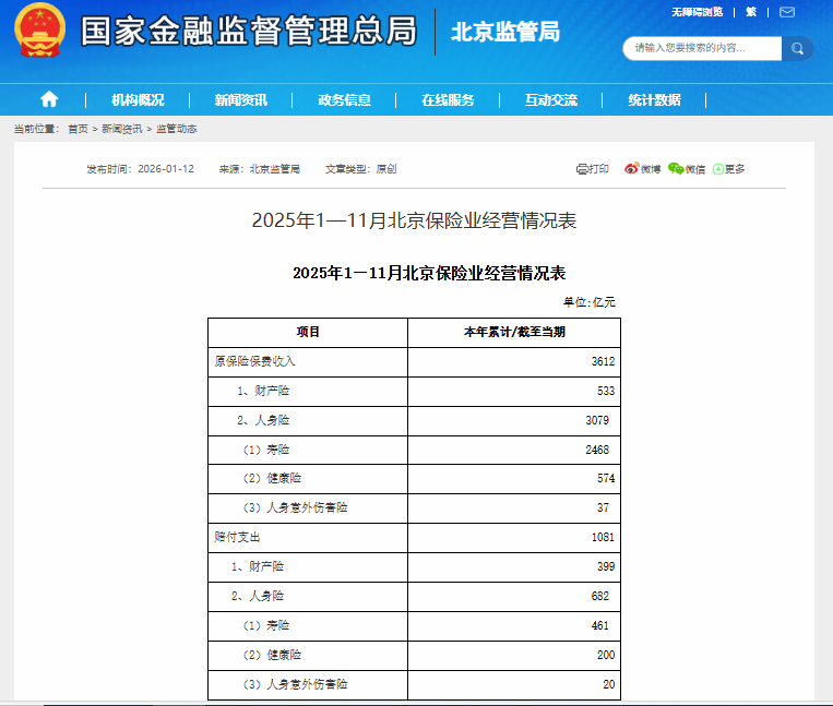 北京:2025年前11月原保费收入3612亿元,同比增长9.36%