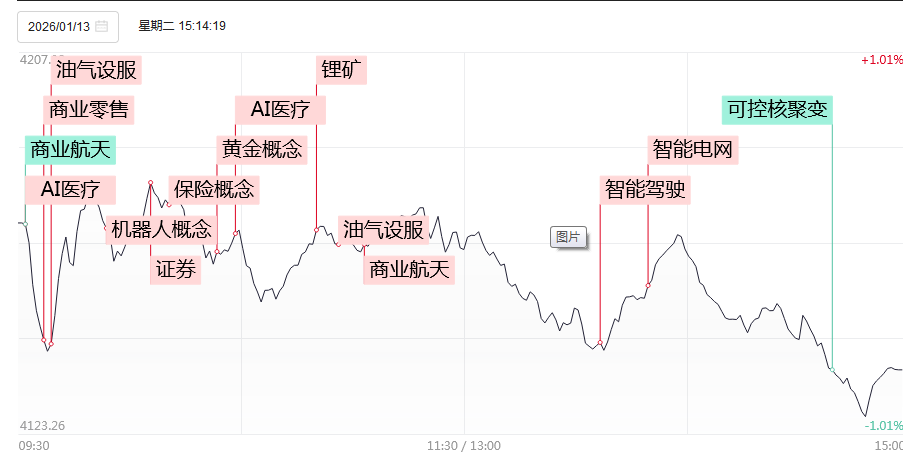 二、涨跌停温度 1月13日,三大指数集体调整,深成指跌超1%,创业板指冲高回落跌近2%。沪深两市成交额3.65万亿,较上一个交易日放量496亿,再创历史天量。盘面 上,全市场75只个股涨停,但超3700只个股下跌。从板块来看,AI应用概念逆势上涨,十余只成分股涨停,引力传媒、利欧股份、省广集团涨停。AI医疗 概念反复活跃,美年健康3连板,泓博医药、新赣江等多股涨停。电网设备概念午后走强,特变电工、三变科技涨停。零售概念表现活跃,三江购物2连板。 下跌方面,商业航天、可控核聚变等板块跌幅居前。其中商业航天概念下挫,顺灏股份、中国卫通等多股跌停。截止收盘,沪指跌0.64%,收报4138.76点; 深证成指跌1.37%,收报14169.40点;创业板指跌1.96%,收报3321.89点。 今日全市场(不含ST股、退市股)共66股涨停,连板股总数29只,61股封板未遂,封板率为52%。焦点股方面,实控人变更的锋龙股份13连板、友邦吊顶9 天7板,商业航天概念股鲁信创投13天11板,AI应用端的引力传媒7天6板。 一、板块异动 | 603598 | 引力传媒 | 13:23 | 3/7天6枚 | 合作 | | --- ...