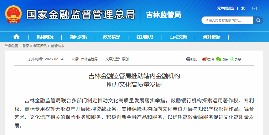 吉林金融监管局:支持保险机构开展文化遗产等相关的保险业务和服务
