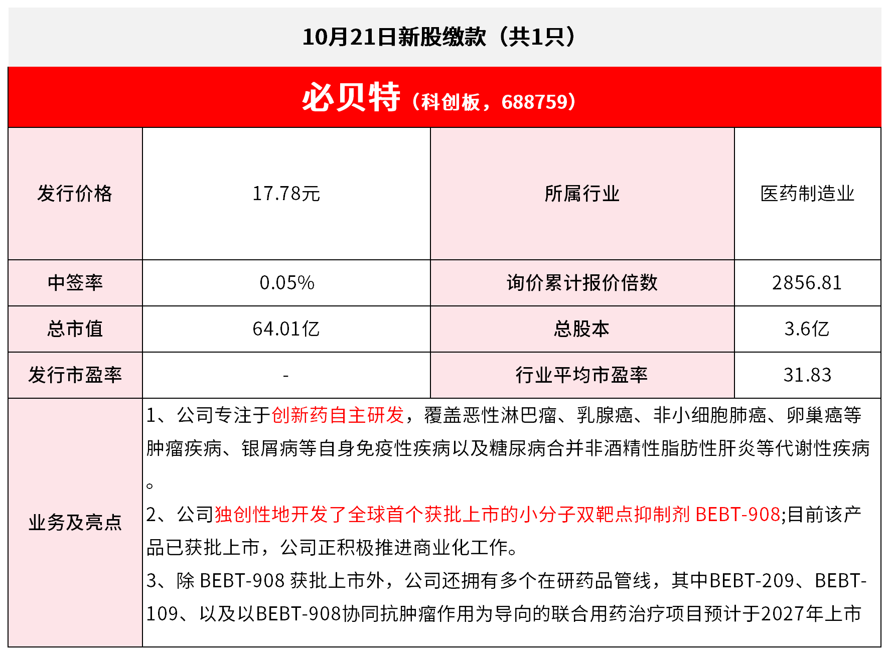 | 发行价格 | 17.78元 | | | --- | --- | --- | | 智签率 | 0.05% | 询价! | | 总市值 | 64.01亿 | | | 发行市盈率 | | 行业 | | 0 业务及亮点 | 1、公司专注于创新药自主研发,覆盖恶性淋巴瘤 肿瘤疾病、银屑病等自身免疫性疾病以及糖尿病 | | | | 2、公司独创性地开发了全球首个获批上市的小ケ | | | | 品已获批上市,公司正积极推进商业化工作。 | | | | 3、除 BEBT-908 获批上市外,公司还拥有多个在 | | | | 109、以及以BEBT-908协同抗肿瘤作用为导向的 | | *免责声明:文章内容仅供参考,不构成投资建议 *风险提示:股市有风险,入市需谨慎 ...