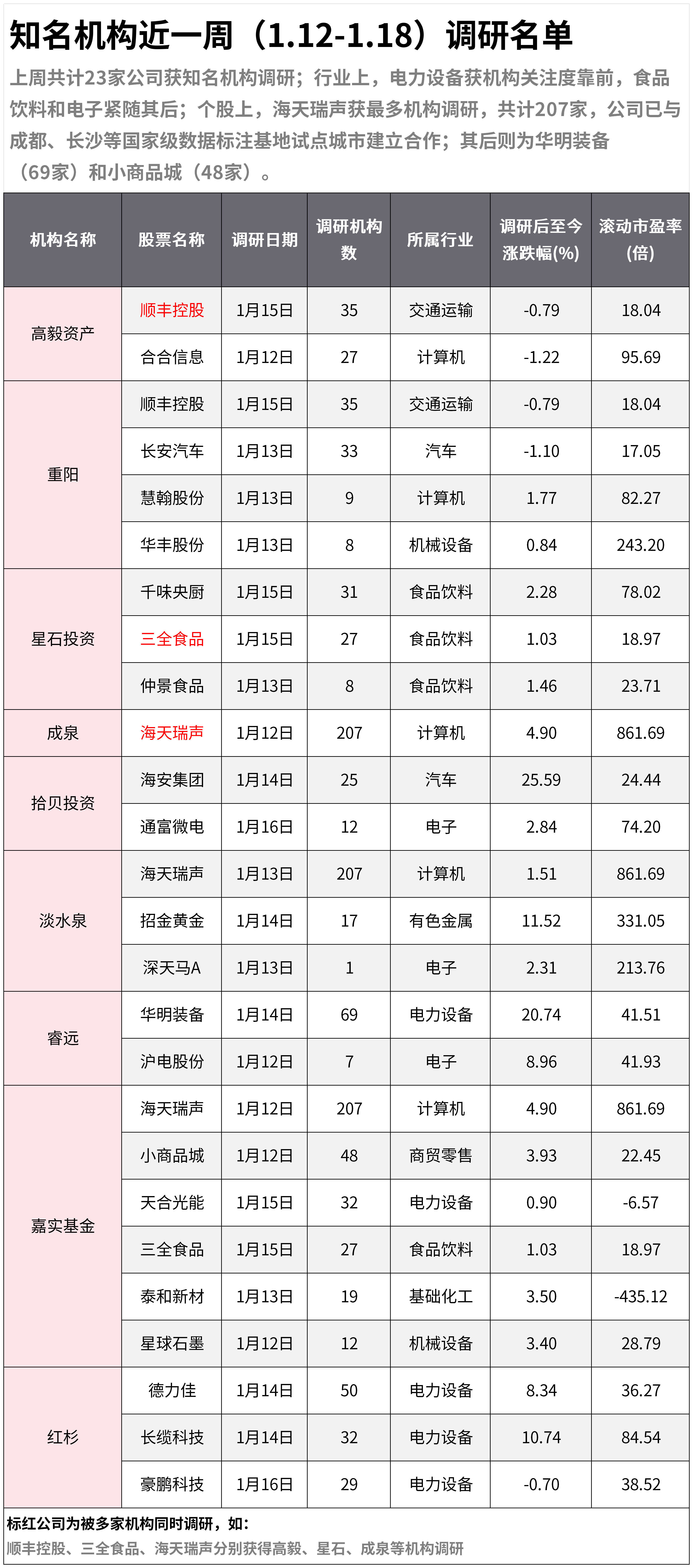 Group 1 - A total of 23 companies received attention from well-known institutions in the past week, with notable mentions in the mechanical, beverage, and electronics sectors [1] - Specific companies highlighted include SF Holding, Chang'an Automobile, and various food-related firms such as Sanquan Foods and Zhongjing Foods [2][3] - Investment firms such as Gao Yi Asset, Starstone Investment, and others have shown interest in companies like Haitan Ruisheng and Haian Group [3][4]