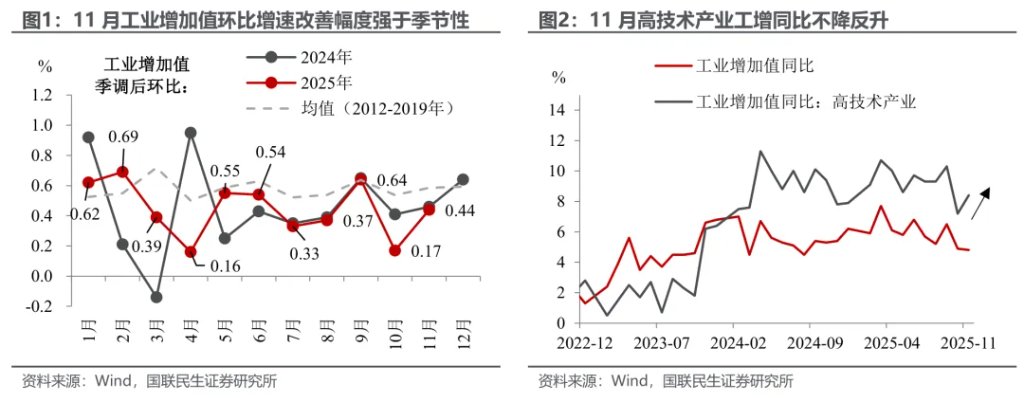 11月经济呈现出 "工业稳、投资与消费缓" 的格局。鉴于政策效果将在明年一季度更为充分显现,当前消费与投资仍面临阶段性逆风,"谁先企 稳"对明年经济"开门红"具有关键的信号意义。对此,我们认为可以从如下角度考虑: 投资端:"乌云中的银线"。虽然房地产下行压力仍在释放,但基建与制造业已不时释放积极信号:11月制造业投资增速止跌回升,初步显现"拐 点";建筑业PMI表现偏强,叠加新增专项债加速发力项目建设,表明"稳投资"的政策储备与执行已在跟进。 消费端:增速放缓背后的复杂局面。除高基数效应外,前期"国补"政策的火热、"双十一"促销前置,均在一定程度上透支了部分消费力,对短期 消费增速形成压制。长远来看,消费复苏仍需依赖消费场景实质性拓展以及居民收入预期改善。 尤其在中央经济工作会议"推动投资止跌回稳"的指引下,"稳投资"政策意图明确。投资有望先于消费实现企稳,成为支撑明年一季度"开门红"的 主要亮点。后续关键仍在于政策"愿望清单"能否如期兑现、向实物工作量有效转化。 工业:同环比背离释放了哪些信号?与改善幅度明显强于季节性的环比增速不同,11月工业增加值同比增速却小幅放缓至4.8%(前值4.9%),两 者的背离 ...
