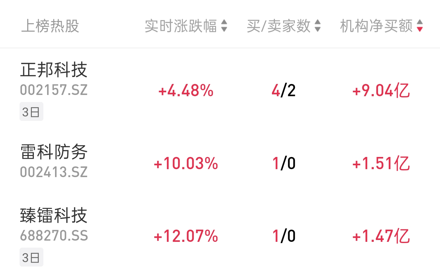 龙虎榜机构热股 今天机构龙虎榜上榜43只个股,净买入23只,净卖出20只。当日机构买入最多的个股前三位是:正邦科技(9.04亿)、雷科防务(1.51亿)、臻镭科技 (1.47亿) | 上榜热股 | 实时涨跌幅♀ 买/卖家数↕ | | | --- | --- | --- | | 正邦科技 | | | | 002157.SZ | +4.48% | 4/2 | | 3日 | | | | 雷科防务 | +10.03% | 1/0 | | 002413.SZ | | | | 臻雷科技 | | | | 688270.SS | +12.07% | 1/0 | | A = | | | 雷科防务 龙虎榜显示,今日1家机构净买入1.51亿。 公司卫星应用业务已构建天地一体化技术体系,形成"星-地-应用"全链条遥感数据解决方案,产品应用于国防安全、智慧城市等十余个国民经济重点领域。 龙虎榜知名游资 一、航天 通宇通讯 个股龙虎榜 公司于2024年底出资3000万元参股卫星核心零部件企业鸿擎科技,强化卫星互联网上游关键部件布局,公司与蓝箭航天同为鸿擎科技股东 航天机电 个股龙虎榜 公司控股股东是上海航天技术研究院(航天八院),后者主 ...