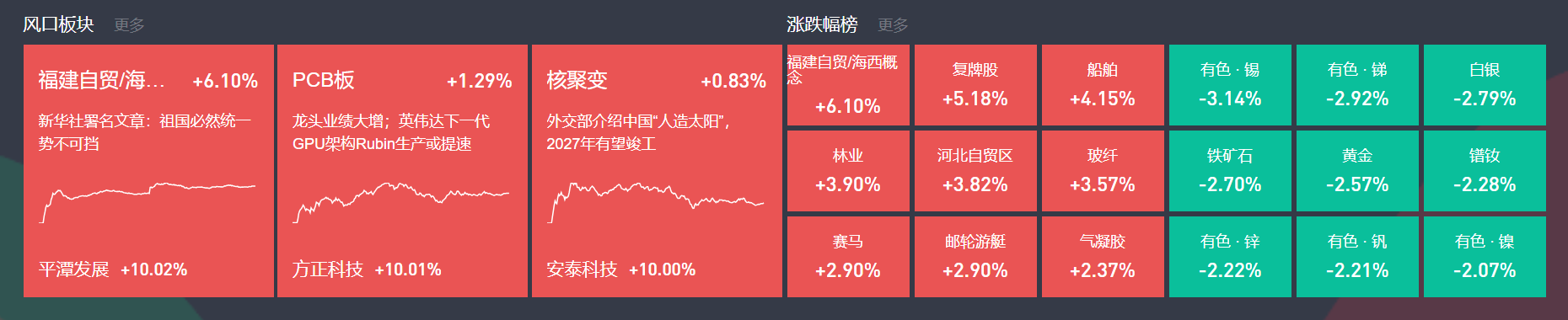 Market Overview - The market experienced slight declines with mixed performance across indices, yet the overall profit-making effect was not strong [3] - The Shanghai Composite Index, Shenzhen Component Index, and ChiNext Index fell by 0.22%, 0.44%, and 0.15% respectively, with nearly 3,000 stocks declining and over 2,300 rising [3] - The total trading volume in the two markets remained at 1.1 trillion [3] Fujian Local Stocks - Fujian local stocks surged significantly following a series of articles from Xinhua News Agency, with notable performances from Pingtan Development and Dahua Intelligent, both achieving four consecutive trading limit increases [7] - The sector saw an overall increase of over 6% by the end of the trading day, marking a true breakout after continuous testing [7] - Other stocks such as Xiamen Port and Xiamen Airport also reached their daily limits, indicating strong investor interest [7] Abstract Stocks - Abstract stocks began to gain momentum in the afternoon, with Unification Holdings leading the charge and achieving a rapid increase [9] - Guotong Holdings attempted to reach its limit but ultimately closed up by 5.48% due to less favorable name recognition compared to peers [9] - Other stocks like Huasheng Technology also saw significant gains, reflecting a trend of speculative trading based on company names [9] Jinfu Technology - Jinfu Technology announced a significant order for a custom-developed cooling architecture for a Taiwanese client, which contributed to its stock price surge [11] - The company is preparing for production related to the next-generation B300 chip, aligning well with market expectations [11] - Despite a history of annual losses, the stock's performance indicates strong speculative interest driven by recent announcements [11] Huajian Group - Huajian Group faced a dramatic decline, with a cumulative drop of over 40% in the last five trading days, attributed to a lack of clarity regarding its future plans [14] - The stock's previous surge of over 200% was linked to speculation about a potential asset restructuring, which was later denied by the company [14] - The recent sell-off has attracted attention from retail investors looking to capitalize on perceived undervaluation despite the stock's volatility [14]