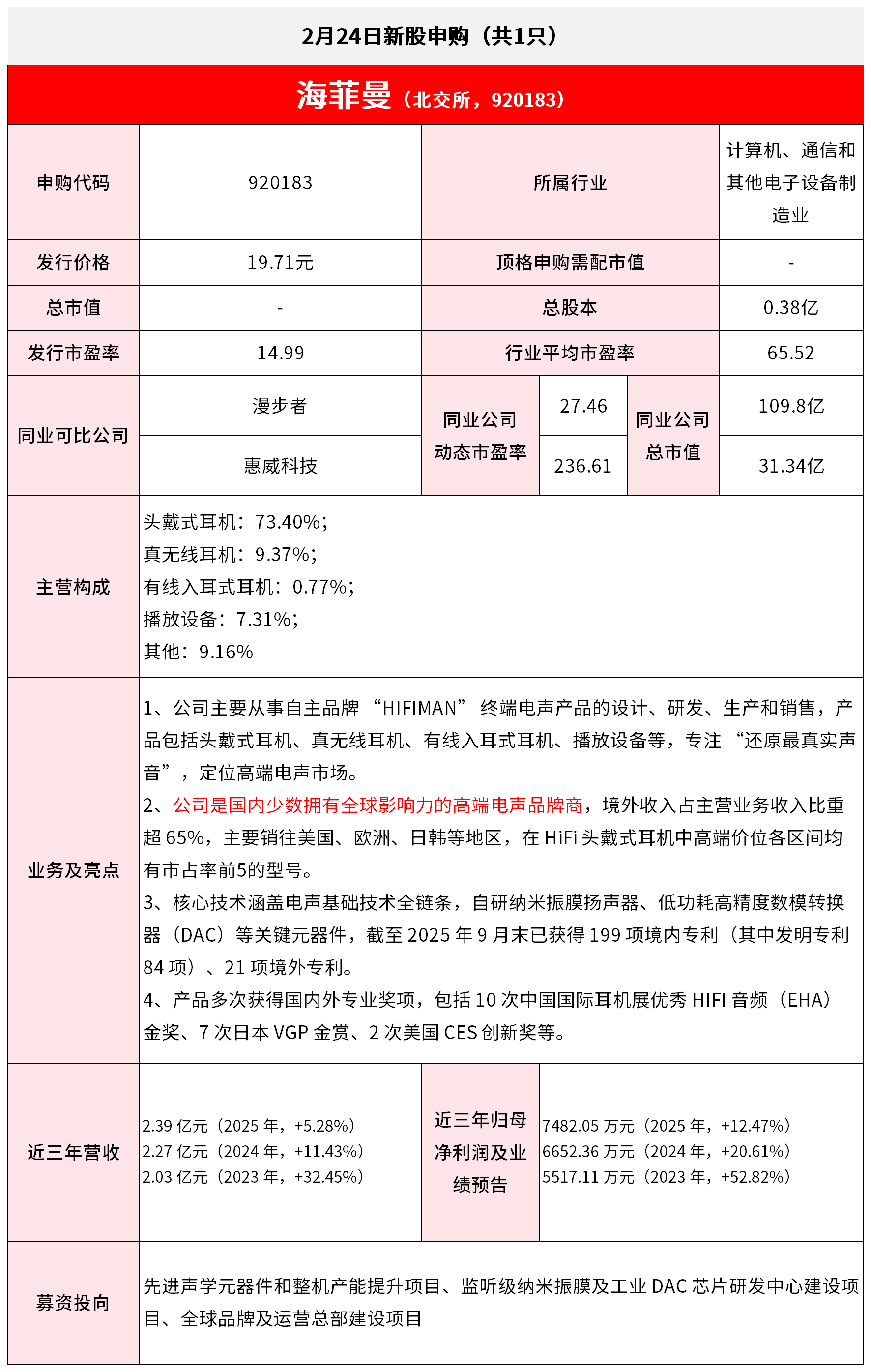 *免责声明:文章内容仅供参考,不构成投资建议 *风险提示:股市有风险,入市需谨慎 2月24日新股申购 (共15 | | 海非曼(北交所, 92018 | | --- | --- | | 申购代码 | 920183 | | 发行价格 | 19.71元 顶格 | | 总市值 | | | 发行市盈率 | 14.99 行业 | | 目业可比公司 | 漫步者 自亦公司 | | | 动态市盈率 惠威科技 | | 主营构成 | 头戴式耳机: 73.40%; | | | 真无线耳机:9.37%; | | | 有线入耳式耳机:0.77%; | | | 播放设备: 7.31%; | | | 其他: 9.16% | | | 1、公司主要从事自主品牌 "HIFIMAN" 终端电, 品包括头戴式耳机、真无线耳机、有线入耳式耳7 | | | 音",定位高端电声市场。 | | 业务及亮点 | 2、公司是国内少数拥有全球影响力的高端电声品 超 65%,主要销往美国、欧洲、日韩等地区,在 有市占率前5的型号。 | | | --- | --- | --- | | | 3、核心技术涵盖电声基础技术全链条,自研纳米 | | | | 器(DAC)等关 ...