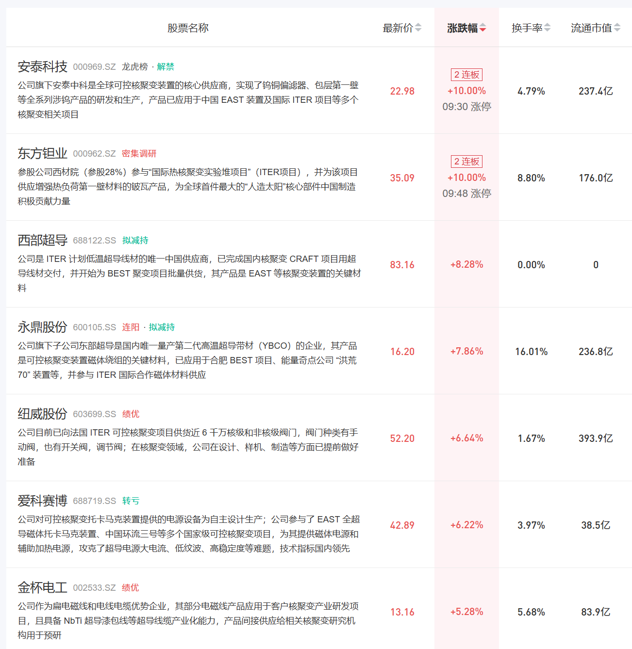 一、行情 10月28日,核聚变板块再度走强,安泰科技、东方坦业2连板,西部超导、永鼎股份等跟涨。 | 股票名称 | 最新价= | 涨跌幅 ◆ | 换手 | | --- | --- | --- | --- | | 安泰科技 000969.SZ 龙虎榜 ·解禁 | | 2 连板 | | | 公司旗下安泰中科是全球可控核聚变装置的核心供应商,实现了钨铜偏滤器、包层第一壁 | | | | | 等全系列涉钨产品的研发和生产,产品已应用于中国 EAST 装置及国际 ITER 项目等多个 | 22.98 | +10.00% | 4.7' | | 核聚变相关项目 | | 09:30 涨停 | | | 乐方铝业 000962.SZ 密集调研 | | 2 连板 | | | 参股公司西材院(参股28%)参与"国际热核聚变实验堆项目"(ITER项目),并为该项目 | 35.09 | +10.00% | 8.81 | | 供应增强热负荷第一壁材料的玻瓦产品,为全球首件最大的"人造太阳"核心部件中国制造 | | 09:48 涨停 | | | 积极贡献力量 | | | | | 西部超导 688122.SS 拟减持 | | | | | 公司 ...