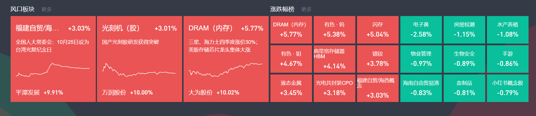 1、行情 市场携周末利好集体高开,并震荡全天。 题材方面,光刻胶因周末消大幅高开,万润科技、彤程新材(一字炸)、晶瑞电材(20CM炸)、艾森股份(20CM炸)、格林达(炸)等纷纷 涨停,联合化学、江化微、南大光电、飞凯材料等集体冲高,但整体呈现冲高回落态势; 存储板块再度大涨,大为股份、德明利2连板,中电港、兆易创新涨停,精智达、聚辰股份、佰维存储、朗科科技等集体大涨; 海西概念盘中爆发,平潭发展、达华智能3连板,海峡创新(20CM)、金龙汽车、福建水泥、漳州发展、厦门钨业、永福股份(20CM炸)等纷 纷涨停; 核聚变概念局部走强,纽威股份、安泰科技、东方钽业涨停,哈焊华通、东方电气、西部超导等大涨; 此外,稀土、中韩自贸区、量子科技、英伟达概念等发力。 截至收盘,沪指、深成指、创业板指分别收涨1.18%、1.51%、1.98%,市场超3300股上涨,1800余股下跌,两市成交量放大至2.3万亿。 今日沪指报收3996.94点,离4000点关口仅差0.06点。 马上就要到老股民毫无赚钱经验的区间了! 2、福建自贸区 据新华网上周五盘后报道,十四届全国人大常委会第十八次会议表决,将10月25日设立为台湾光复纪念 ...