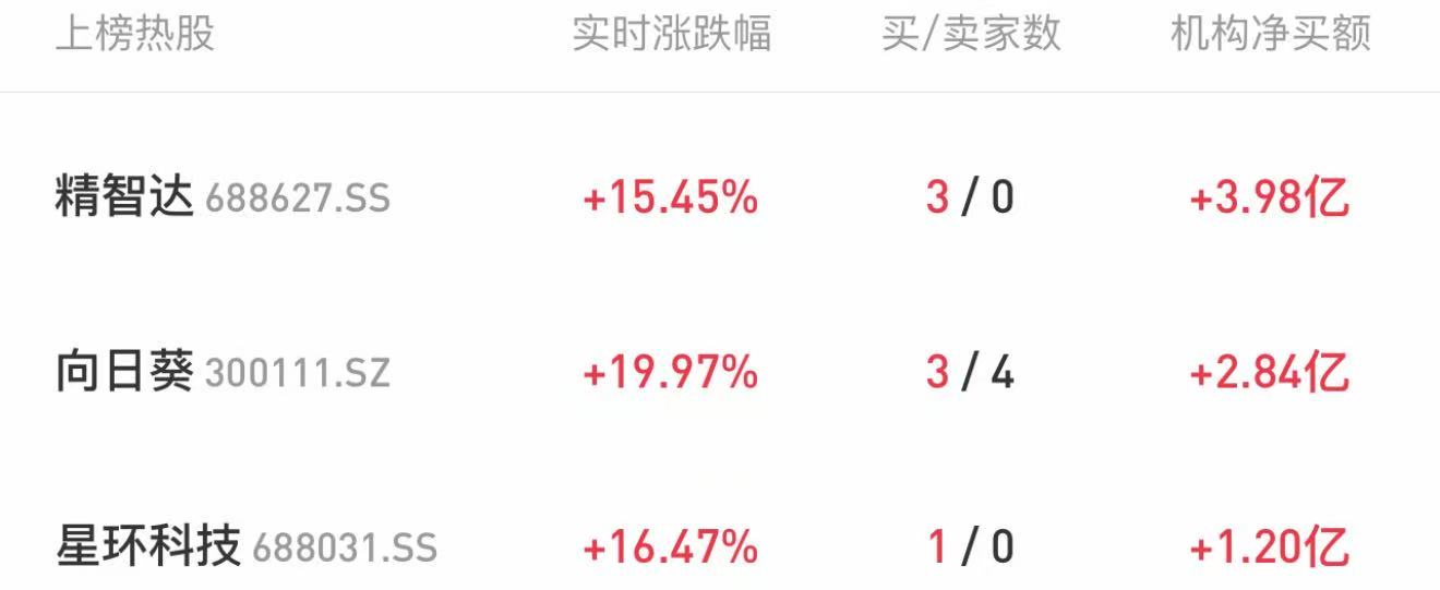 龙虎榜机构热股 今天机构龙虎榜上榜31只个股,净买入17只,净卖出14只。当日机构买入最多的个股前三位是:精智达(3.98亿)、向日葵(1.87亿)、星环科技(1.2 亿)。 | 上榜热股 | 实时涨跌幅 | 买/卖家数 | 村 | | --- | --- | --- | --- | | 精智达 688627.SS | +15.45% | 3/0 | | | 向日葵 300111.SZ | +19.97% | 3/4 | | 个股龙虎榜 海峡创新 个股龙虎榜 二、内存 精智达 龙虎榜显示,今日3家机构净买入3.98亿。 公司在研项目包括新一代DRAM高速测试机高速互联技术(18Gbps),该项目是面向下一代DRAM后道高速测试需求,解决DDR6/LPDDR6/GDDR7等高速 测试需求。 龙虎榜知名游资 一、海西概念 据新华网10月24日报道,十四届全国人大常委会第十八次会议表决,将10月25日设立为台湾光复纪念日。 平潭发展 公司是境内规模最大的电子元器件分销商。据招股说明书:公司在存储器产品市场代理了 Micron(美光)、长江存储等全球头部存储芯片厂商的产品。 *免责声明:文章内容仅供参考,不构成投资建 ...