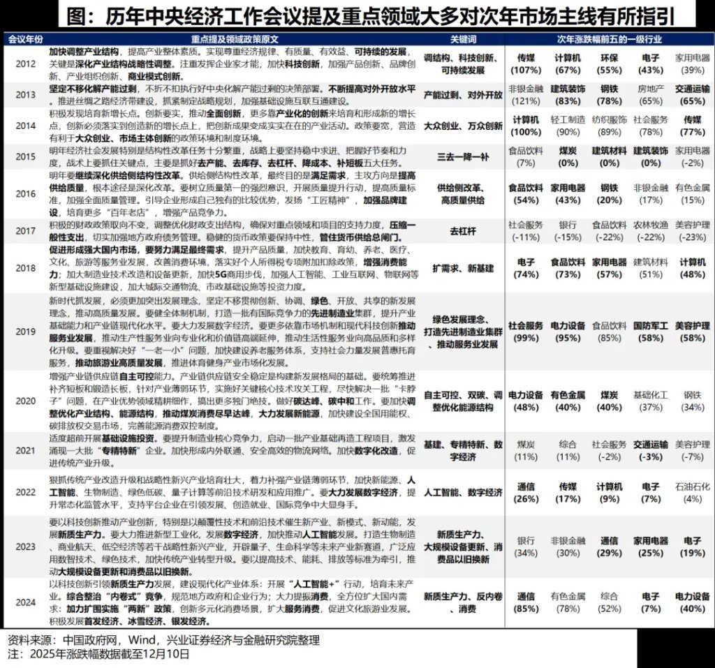 中央经济工作会议即将召开。参考历史经验,历年中央经济工作会议所提及的重点领域大多对次年市场主线有所指引。回顾2012年以来历次中央 经济工作会议,不仅其整体定调会对经济预期和风险偏好有重要影响,且强调的重点领域大多都会反映在次年的市场主线上,典型如13-15年 的"调结构"、"大众创业、万众创新",16-17年的"供给侧改革",以及20-21年的"自主可控"、"双碳"。 去年中央经济工作会议中重点强调的"新质生产力&反内卷",也成为今年A股两条最重要的主线。 本文来源:尧望后势。 *免责声明:文章内容仅供参考,不构成投资建议 *风险提示:股市有风险,入市需谨慎 | 会议年份 | 重点提及领域政策原文 | 关键词 | | | 次年涨跌幅前五的一级行业 | | | | --- | --- | --- | --- | --- | --- | --- | --- | | | 加快调整产业结构,提高产业整体素质。实现尊重经济规律、有质量、有效益、可持续的发展 | 调结构、科技创新、 | 传媒 | 计算机 | 环保 | 电子 | 家用电器 | | 2012 | 关键是深化产业结构战略性调整。注重发挥企业家才能,加快科技创 ...