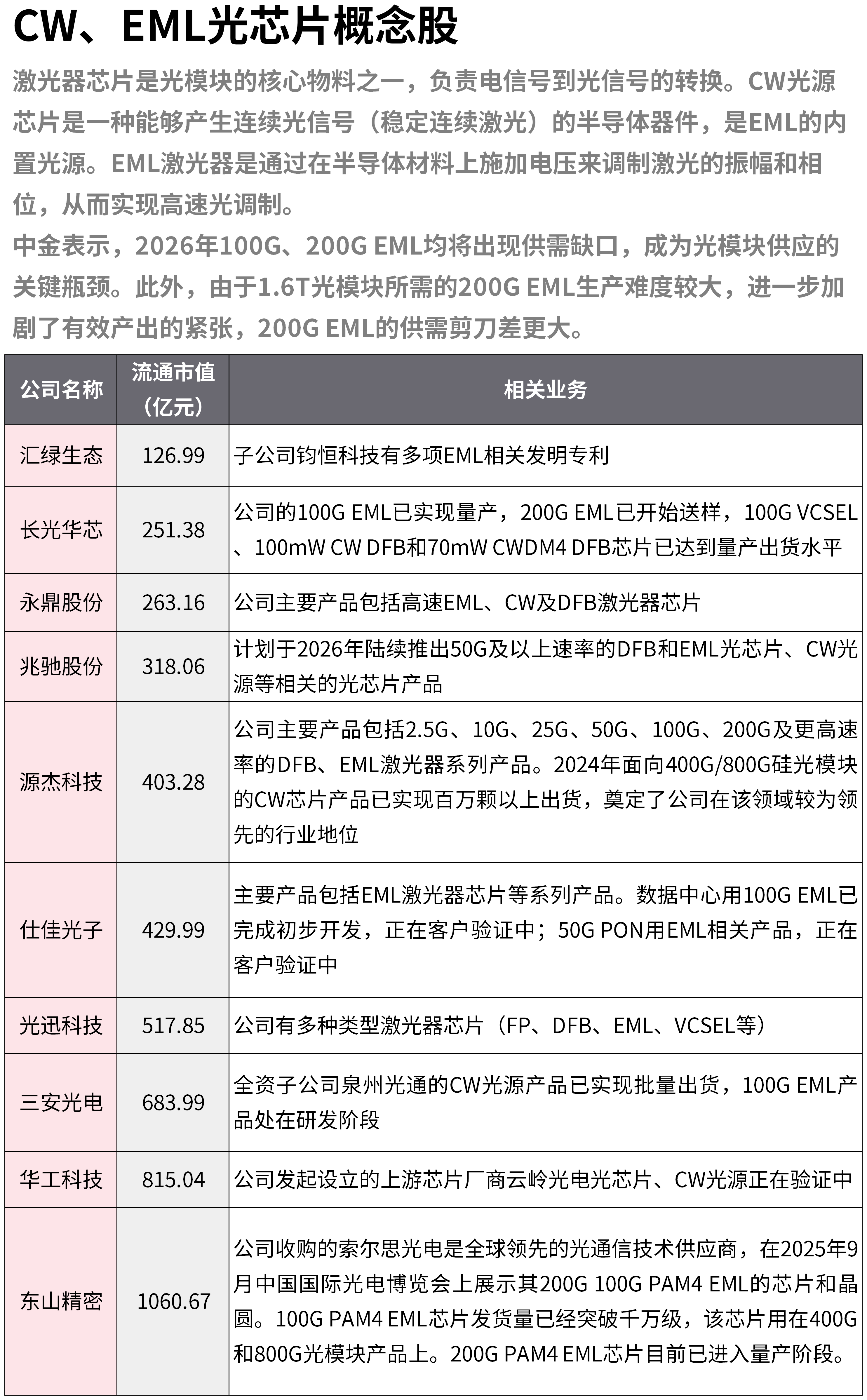 | | エノし J | | 牛ノブ.フ フロリメイリソ | | --- | --- | --- | | | | 客户验证 | | 光迅科技 | 517.85 | 公司有多; | | 三安光电 | 683.99 | 全资子公 | | | | 品处在研. | | 华工科技 | 815.04 | 公司发起· | | | | 公司收购I 月中国国 | | 东山精密 | 1060.67 | 園。 100G | | | | 和800G光 | *免责声明:文章内容仅供参考,不构成投资建议 *风险提示:股市有风险,入市需谨慎 CW、EML光芯片 激光器芯片是光模块的核心物 芯片是一种能够产生连续光信 置光源。EML激光器是通过在 位,从而实现高速光调制。 中金表示,2026年100G、2 关键瓶颈。此外,由于1.6Tシ 剧了有效产出的紧张,200G 流通市值 公司名称 (亿元) 汇绿生态 | 126.99 | 子公司钧' | 长光华芯 | 251.38 | 必目B210 | | --- | --- | --- | | | | 100mW | | 永鼎股份 | 263.16 | 公司主要/ | | 兆驰股份 | 318.06 ...