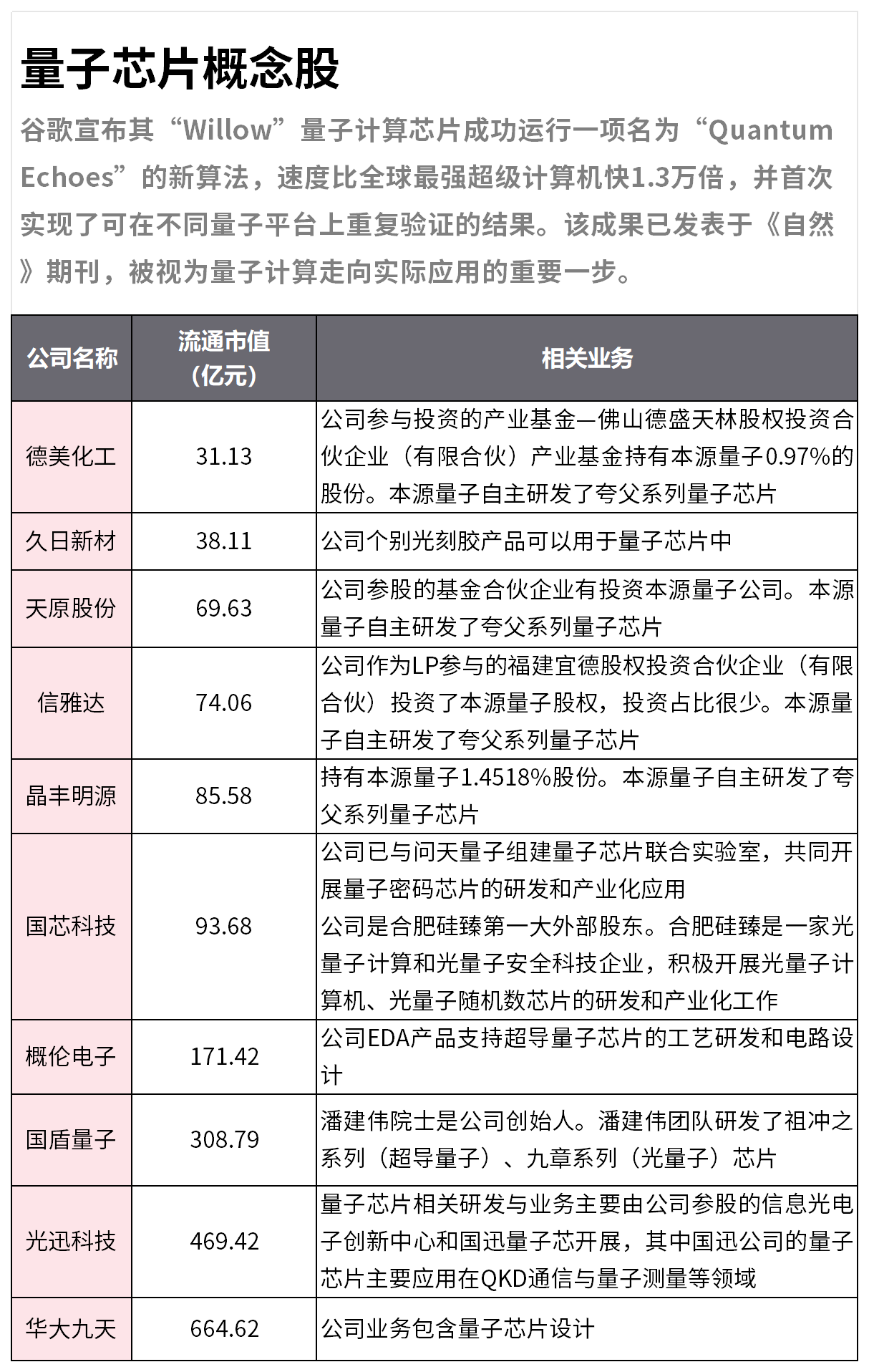 Group 1 - Google announced that its "Willow" quantum computing chip successfully ran a new algorithm called "Quant Echoes," achieving speeds 13,000 times faster than the world's strongest supercomputer, marking a significant step towards practical applications of quantum computing [1] - The results of the "Quant Echoes" algorithm have been published in a journal, indicating the repeatability of results across different quantum platforms [1] Group 2 - Demai Chemical has a market capitalization of 31.13 billion and is involved in an investment fund that holds shares in Benyuan Quantum, which has developed the Kuafu series of quantum chips [2] - Jiumu New Materials has a market capitalization of 38.11 billion, with certain photoresist products applicable in quantum chips [2] - Tianyuan Co. has a market capitalization of 69.63 billion and is a partner in a fund that has invested in Benyuan Quantum [2] - Xinyada has a market capitalization of 74.06 billion and has a minor investment in Benyuan Quantum through a partnership [2] - Jingfeng Mingyuan holds 1.4518% of Benyuan Quantum shares and is involved in the development of the Kuafu series of quantum chips [2] - Guoxin Technology has a market capitalization of 93.68 billion and has established a joint laboratory for quantum chip development [2] - Gallen Electronics has a market capitalization of 171.42 billion, with EDA products supporting the development of superconducting quantum chips [2] - Huada Jiutian has a market capitalization of 664.62 billion and is engaged in quantum chip design [3]