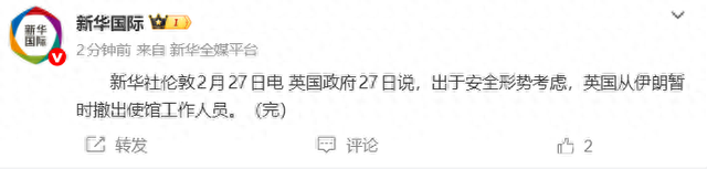 来源:新华社 新华社伦敦2月27日电 英国政府27日说,出于安全形势考虑,英国从伊朗暂时撤出使馆工作人员。 (完) ...