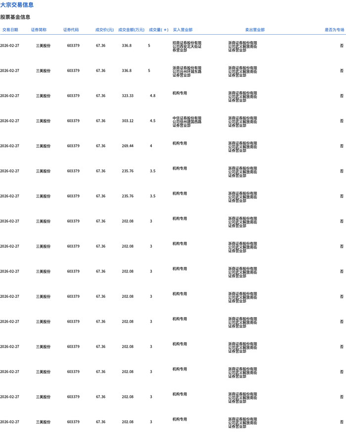 2月27日,三美股份大宗交易成交459.5万股,成交额3.1亿元,占当日总成交额的42.27%,成交价67.36 元,较市场收盘价73.17元折价7.94%。 | 2026-02-27 | 三美股份 | 603379 | 67.36 | 875.68 | 13 | | 1 | KA | | --- | --- | --- | --- | --- | --- | --- | --- | --- | | 2026-02-27 | 三美股份 | 603379 | 67.36 | 808.32 | 12 | 机构专用 | | 문 | | 2026-02-27 | 三美股份 | 603379 | 67.36 | 673.6 | 10 | 高美美 | | 图 | | 2026-02-27 | 三美股份 | 603379 | 67.36 | 673.6 | 10 | | | 질 | | 2026-02-27 | 三美股份 | 603379 | 67.36 | 673.6 | 10 | | | 星 | | 2026-02-27 | 三美股份 | 603379 | 67.36 | 653.39 | 9.7 | 机构专用 | | ...