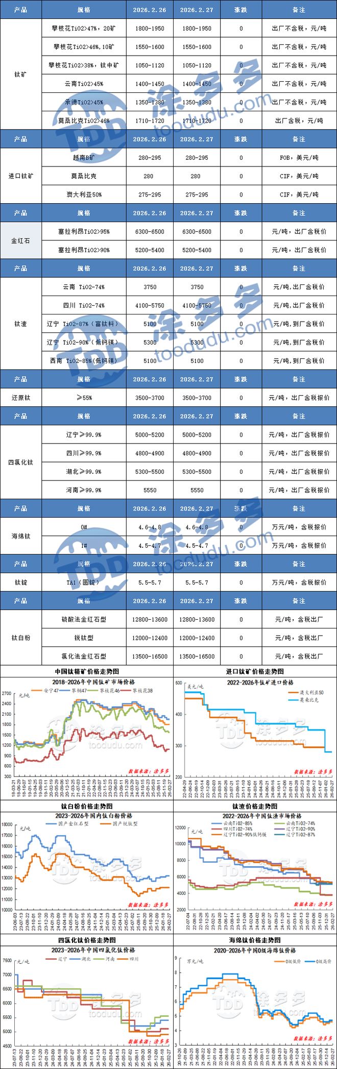 来源:市场资讯 (来源:钛资讯) 涂多多-钛日刊 一、钛市场简述 钛矿 今日攀西钛矿价格指数1775.00,较昨日持平。国内钛矿选厂开工不足,市场新单询盘偏弱,多在观 望,钛矿价格暂稳。 钛渣 2月北方企业90%低钙镁高渣招标价格5300元/吨,较1月价格下降100元/吨,原辅料成本价格较高,渣厂 维持降负荷生产,市场供需处于弱平衡,高渣价格维持低位。 四氯化钛 四氯化钛市场报价4800-5550元/吨,四氯化钛市场运行稳定,成本影响下,价格维持平稳。 海绵钛 一级海绵钛民品价格在4.5-4.7万元/吨左右,0级海绵钛报价4.6-4.8万元/吨左右,下游需求有所支撑,海 绵钛新单价格坚挺运行。 钛白粉 今日钛白粉价格指数13490.03,较昨日持平。三家氯化法企业先后发函宣涨500元/吨,据悉龙企计划发 函,市场观望情绪浓厚,钛白市场暂时持稳。 | 12000 | WALL | 60000 60 60 | CUGU. 6. 61 | 200 000 | 10 11 | | --- | --- | --- | --- | --- | --- | | 金红石 | 塞拉利品Ii02>95% | 6300-6500 ...