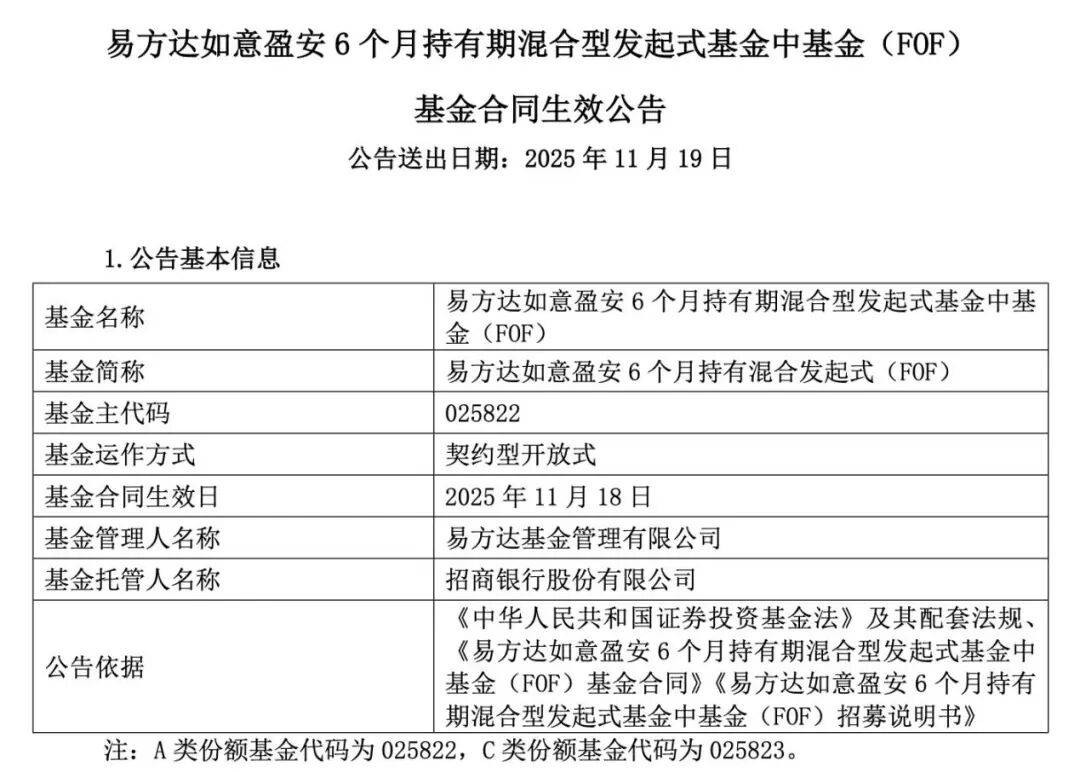 易方达基金公告,易方达如意盈安6个月持有混合发起式(FOF)正式成立,发行规模超58亿元,是四季度以来募集规模最大的新基金,也是年内第四只 发行规模超50亿元的公募FOF。 据了解,这只新基金的托管行为有"零售之王"之称的招商银行,属于招行"TREE长盈计划"的一员,定位为中低波动产品。今年以来,FOF诞生多只"爆 款"产品,其中不少在"长盈计划"中。 【导读】易方达如意盈安6个月持有期混合FOF募集规模超58亿元 中国基金报记者 方丽 孙晓辉 新基金发行市场再现小"爆款"。 公告显示,该基金于2015年11月18日正式成立,有效认购总户数为24688户,募集规模为58.48亿份。其中,基金管理人固有资金持有1000.16万份,占基金 总份额比例为0.17%。 11月14日,易方达如意盈安6个月持有混合FOF发布提前结束募集的公告。该基金自11月10日开始募集,原定募集截止日为11月21日,后提前至11月14 日。 募集规模超58亿元 公募FOF发行再现小"爆款" 公募FOF发行再现小"爆款"。 11月19日,易方达基金发布易方达如意盈安6个月持有混合发起式(FOF)基金合同生效公告。 | 基金名称 | 易方 ...
