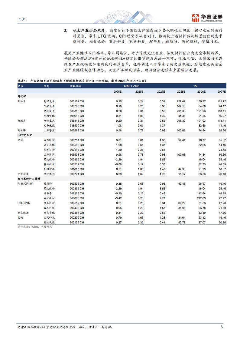 关于报告的所有内容,请于公众『市场分析报告』阅读原文 《太空光伏,未来最具确定性的25家公司》 近日,中国一次性向国际通信联盟提交了超20万颗卫星的部署计划,同时,SpaceX也向美国联邦通信委员会申请 发射100万颗卫星。这一轮卫星互联网的密集部署,背后不仅是频轨资源的排他性争夺,更预示着太空基础设施 建设正从单纯的通信功能向算力上天演进。在大国科技竞争的背景下,低轨卫星市场的规模正从数十兆瓦级向百 兆瓦、甚至吉瓦级迈进,能源补给成为了限制太空资产扩张的核心瓶颈。 本次梳理重点聚焦太空光伏这一前沿领域,通过对太空算力趋势、太空光伏市场前景以及中国相关产业链企业发 展机遇的系统性分析,展现能源转型在星辰大海中的新路径。太空光伏主要包含太空对太空供电(S2S)以及太 空对地面供电(S2E)两大主流场景,前者决定了当前卫星与空间站的生命线,后者则承载着人类实现24小时全 天候清洁能源补给的终极梦想。 一、轨道资源与太空算力驱动能源变革 短期内,太空卫星基础设施的频轨资源具有显著的先到先得特征。由于地球轨道空间有限,且电磁频谱属于不可 再生资源,谁先占领轨道并投入运行,谁就拥有了这一区域的话语权。随着人工智能应用呈 ...