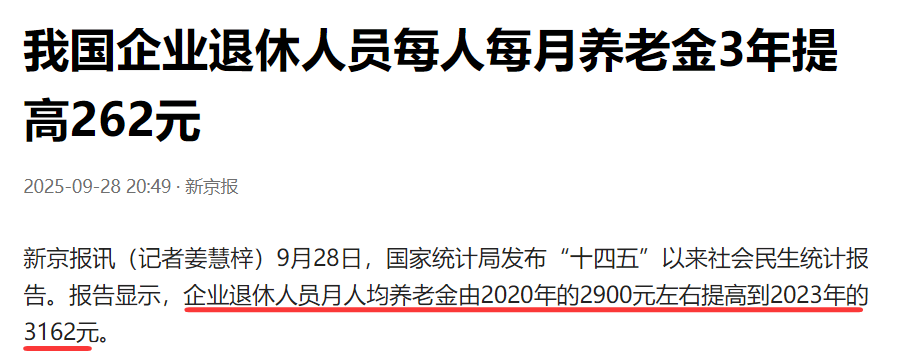 3年提高262元,企业退休职工人均养老金达到3162元,农民呢?