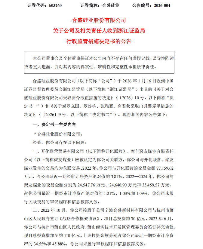一封警示函,把董事长、总经理、财务总监、董秘全都列了上去,合盛硅业似乎总容易在春节前夕收割 一波热搜。 证券代码:603260 证券简称:合盛硅业 公告编号:2026-004 合盛硅业股份有限公司 关于公司及相关责任人收到浙江证监局 行政监管措施决定书的公告 本公司董事会及全体董事保证本公告内容不存在任何虚假记载、误导性陈述 或者重大遗漏,并对其内容的真实性、准确性和完整性承担法律责任。 合盛硅业股份有限公司(以下简称"公司")于2026年1月16日收到中国 证券监督管理委员会浙江监管局(以下简称"浙江证监局")出具的《关于对合 盛硅业股份有限公司采取责令改正措施的决定》((2026)10号,以下简称"决 定书一")和《关于对罗立国、罗烨栋、张雅聪、高君秋采取出具警示函措施的 决定》((2026)9号,以下简称"决定书二")。现将相关内容公告如下: 一、决定书一主要内容 "合盛硅业股份有限公司: 经查,你公司存在以下问题: 一、开化联营贸易有限公司(以下简称开化联营)、库车聚友煤业有限责任 公司(以下简称聚友煤业)应被认定为你公司关联方,你公司与开化联营、聚友 煤业发生的交易均为关联交易 2022年,你公司与 ...