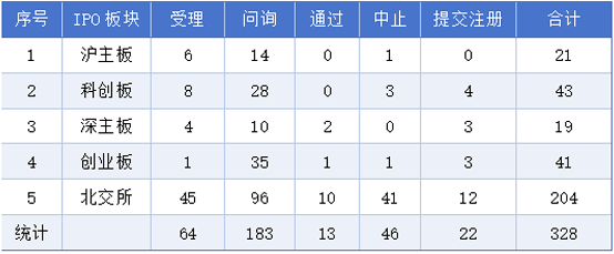 中国上市公司网 1月12日-18日期间IPO动态各个阶段速览: 一、IPO排队企业情况(328家) 截至1月18日,IPO排队企业328家,其中沪主板排队企业21家,科创板排队企业43家,深主板排队企业 19家,创业板排队企业41家,北交所排队企业204家。 | 序号 | IPO 板块 | 受理 | 问询 | 通过 | 中止 | 提交注册 | 合计 | | --- | --- | --- | --- | --- | --- | --- | --- | | 1 | 沪主板 | 6 | 14 | 0 | 1 | 0 | 21 | | 2 | 科创板 | 8 | 28 | 0 | 3 | র্ব | 43 | | 3 | 深主板 | র্ব | 10 | 2 | 0 | 3 | 19 | | র্ব | 创业板 | 1 | 35 | 1 | 1 | 3 | 41 | | 5 | 北交所 | 45 | 96 | 10 | 41 | 12 | 204 | | 统计 | | 64 | 183 | 13 | 46 | 22 | 328 | 二、新增上市企业情况(2家) 1月12日至1月18日期间,重庆至信实业股份有限公司、 ...