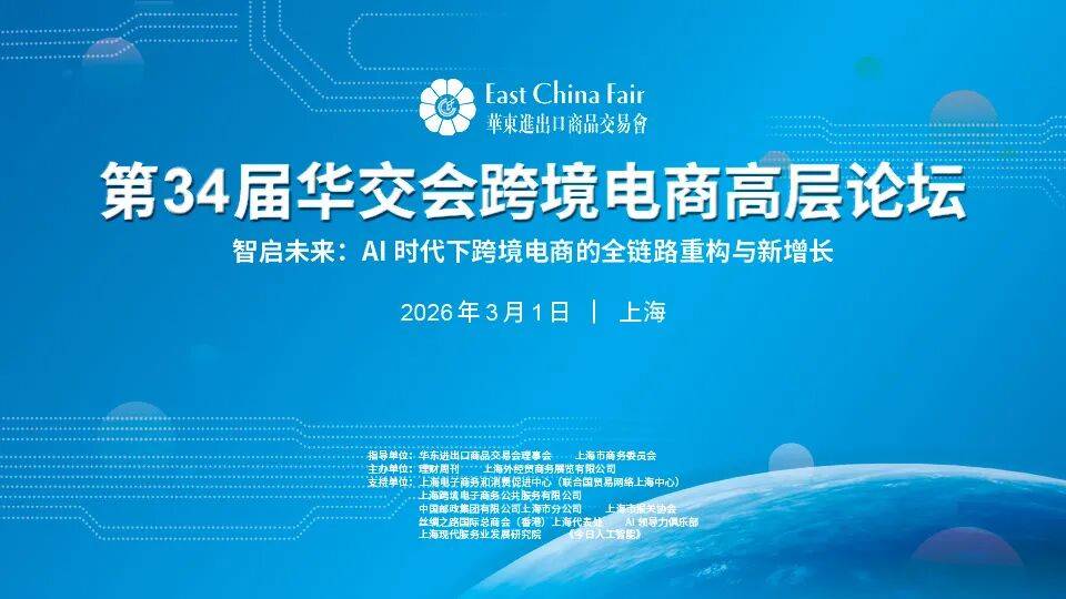 来源:《理财周刊》 2026年3月1日- 4日,第34届华东进出口商品交易会将在上海新国际博览中心盛大举办,作为展会核心亮点活动,第34届华交会跨境电商高层 论坛也将同期重磅开启。 本届论坛以"智启未来:AI时代下跨境电商的全链路重构与新增长"为主题,汇聚政企学界重磅嘉宾,聚焦 AI 技术对跨境电商产业链的深度重 塑,为行业搭建前沿交流与资源对接平台。 当前,全球跨境电商行业正迎来AI驱动的深度变革,2025年我国跨境电商进出口达2.75万亿元,较2020年增长69.7%,AI技术已全面渗透选 品、运营、物流、金融、人才培养等全链路环节,成为行业高质量发展的核心引擎。在此背景下,本届论坛在华东进出口商品交易会理事会、 上海市商务委员会指导下,由理财周刊、上海外经贸商务展览有限公司主办,在八家行业权威机构的支持下,聚焦行业核心命题,解码AI时 代跨境电商发展新路径。 论坛将邀请全国政协常委、上海市商务委等政府主管部门领导,以及世界500强咨询公司AI领域专家、高校知名学者、以及阿里国际、亚马逊 全球开店、中国邮政、汇付国际等头部企业重磅嘉宾出席。现场将通过主旨演讲、实战分享等形式,围绕 AI 时代企业组织转型、 ...