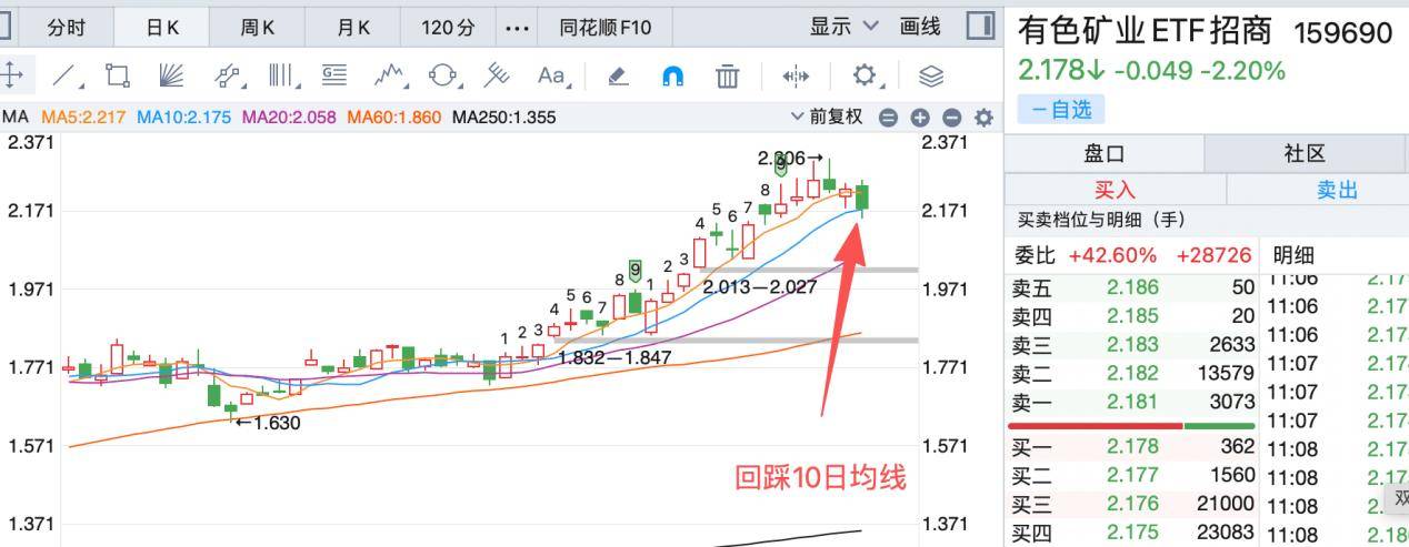 黄金方面,全球央行持续购金、美元信用体系趋弱、地缘政治避险情绪升温,三大因素共振,推动金价进入上行通道。 最强赛道之一有色金属终于跌了! 贵金属、工业金属方面,则受益于供给端刚性约束与需求结构升级——光伏、新能源汽车、机器人、算力等新兴产业持续放量,为金属需求注入强劲且确定 的成长性,推动价格走高。 有色矿业ETF招商(159690)一度跌超3%,但迅速回升稳在10日均线左右,对于强势品种来说,在均线位置一般会形成支撑。 | 分时 | 日K 周K | 月K | 120分 | ... | 同花顺F10 | | | 显示 √ 画线 | | | | 有色矿业 ETF J | | | --- | --- | --- | --- | --- | --- | --- | --- | --- | --- | --- | --- | --- | --- | | + / 10 | W | 8, III, E Nº O. X Aa, | | | | C | 日 | 41 | a | ટ | | 2.178 J -0.049 -1 | | | | MA MA5:2.217 MA10:2.175 MA20:2.058 MA60:1. ...