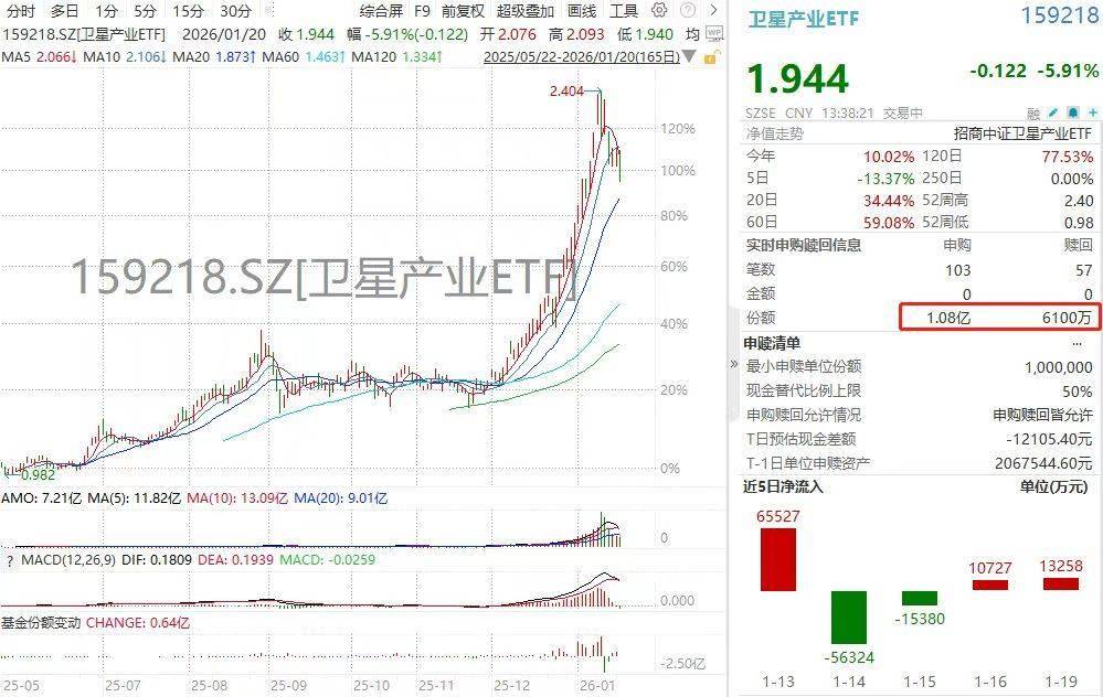 消息面,1月19日15时48分,我国在海南商业航天发射场使用长征十二号运载火箭,成功将卫星互联网低轨19组卫星发射升空,卫星顺利进入 预定轨道,发射任务获得圆满成功。分析指出,这是我国卫星互联网星座建设的又一次稳步推进,有力印证了产业正按规划加速落地,为行 业提供了坚实的订单与发展预期。在商业航天产业化、低轨星座建设加速的长期趋势下,卫星产业已成为市场公认的高景气赛道。 据了解,作为市场上首支收益翻倍、跟踪中证卫星产业指数的ETF,卫星产业ETF(159218)涵盖卫星制造、发射、导航通信应用等上中下游企 业,随着商业化进程的实质性突破接踵而至,该板块有望持续吸引长线配置资金的目光。 风险提示:基金有风险,投资需谨慎。 1月20日,卫星板块延续调整,资金逢低布局意图明显。数据显示,截至13时34分,两融标的卫星产业ETF(159218)跌5.95%,臻镭科技、航天 环宇、航宇微、长江通信、中国卫通跌幅居前。资金热度不减,据Wind Level2实时行情结合均价预估,盘中净流入约9600万,截至发稿,该 基金获资金连续3日净流入,累计约3.4亿。 ...