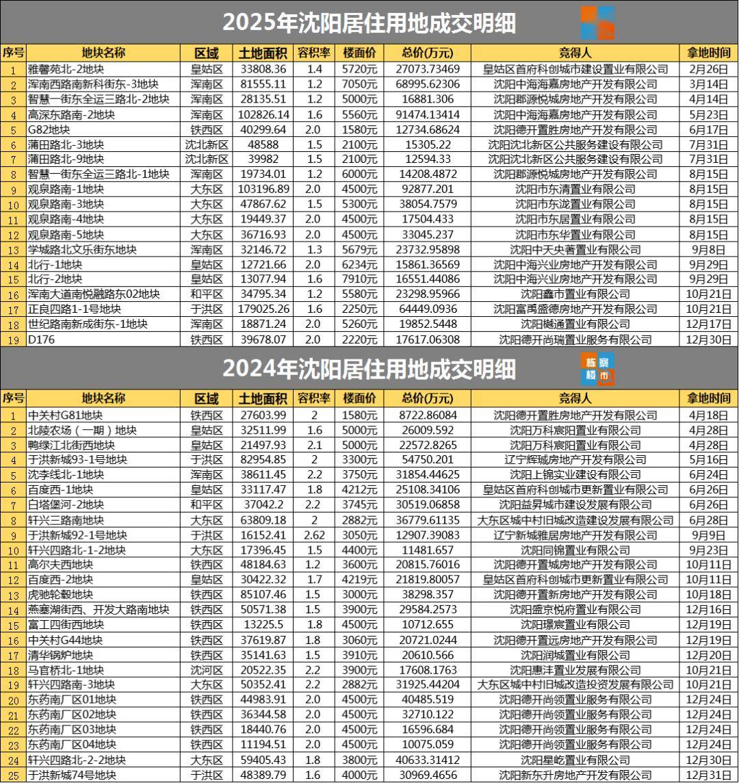 | 序号 | 地块名称 | × 可 | 土地面积 | 容积率 | 楼面价 | 总价(万元) | 竞得人 | 拿地时间 | | --- | --- | --- | --- | --- | --- | --- | --- | --- | | 1 | 雅馨苑北-2地块 | 皇姑区 | 33808.36 | 1.4 | 5720元 | 27073.73469 | 皇姑区自府科创城市建设 业有限公司 | 2月26日 | | 2 | 浑南四路南新科街东-3地块 | 年南区 | 81555.11 | 1.2 | 705070 | 68995.62306 | 沈阳中海海嘉房地产开发有限公司 | 3月14日 | | 3 | 智慧一街乐全运三路北-2地块 | 洋南区 | 28135.51 | 1.2 | 5000元 | 16881.306 | 沈阳郡源悦城房地产开发有限公司 | 4月14日 | | র্ণ | 高深乐路南-2地块 | 浑南区 | 102826.14 | 1.6 | 5560TT | 91474.13414 | 沈阳中海海嘉房地产开发有限公司 | 5月23日 | | 5 | G82地块 | 铁西区 | 40299. ...