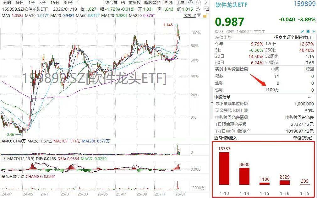 神秘资金持续加码AI应用!软件龙头ETF(159899)盘中连续第7日净流入!石基信息、四方精创、莱斯信息跌幅居前