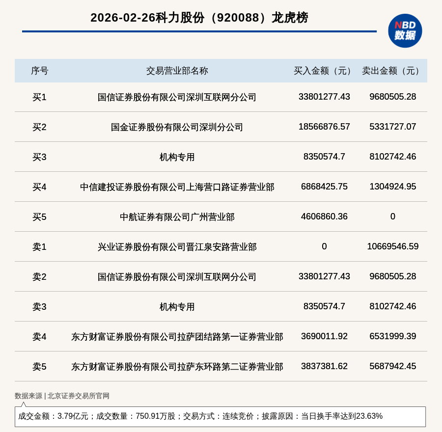 每经讯,2026年2月26日,北交所上市公司科力股份(920088,收盘价:50.16元)登上龙虎榜,交易方式是连续竞价,披露原因 是当日换手率达到23.63%,成交数量750.91万股,成交金额3.79亿元。买一席位为国信证券股份有限公司深圳互联网分公司,买 入3380.13万元;卖一席位为兴业证券股份有限公司晋江泉安路营业部,卖出1066.95万元。 | | 2026-02-26科力股份(920088) 龙虎榜 | | | | --- | --- | --- | --- | | 序号 | 交易营业部名称 | 买入金额(元) | 卖出金额(元) | | नेट ग | 国信证券股份有限公司深圳互联网分公司 | 33801277.43 | 9680505.28 | | 买2 | 国金证券股份有限公司深圳分公司 | 18566876.57 | 5331727.07 | | 址3 | 机构专用 | 8350574.7 | 8102742.46 | | ग्रेन | 中信建投证券股份有限公司上海营口路证券营业部 | 6868425.75 | 1304924.95 | | ન્નેર | 中航证券有限公司广州营业部 ...