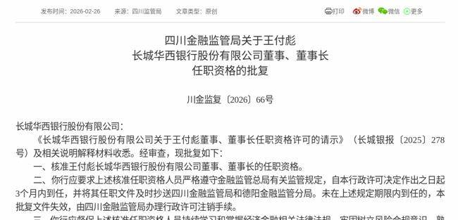 2026年2月26日,根据国家金融监督管理总局消息,《长城华西银行股份有限公司关于王付彪董事、董 事长任职资格许可的请示》获得通过,批复王付彪长城华西银行股份有限公司董事、董事长的任职资 格。 根据批复表示,长城华西银行应要求上述核准任职资格人员严格遵守金融监管总局有关监管规定,自本 行政许可决定作出之日起3个月内到任,并将其任职文件及时抄送四川金融监管局和德阳金融监管分 局。未在上述规定期限内到任的,本批复文件失效,由四川金融监管局办理行政许可注销手续。长城华 西银行应督促上述核准任职资格人员持续学习和掌握经济金融相关法律法规,牢固树立风险合规意识, 熟悉任职岗位职责,保证在长城华西银行的履职时间和精力,忠实勤勉履职。未尽事项按金融监管总局 有关规定办理。 声明:市场有风险,投资需谨慎。本文为AI基于第三方数据生成,仅供参考,不构成个人投资建议。 来源:市场资讯 ...
