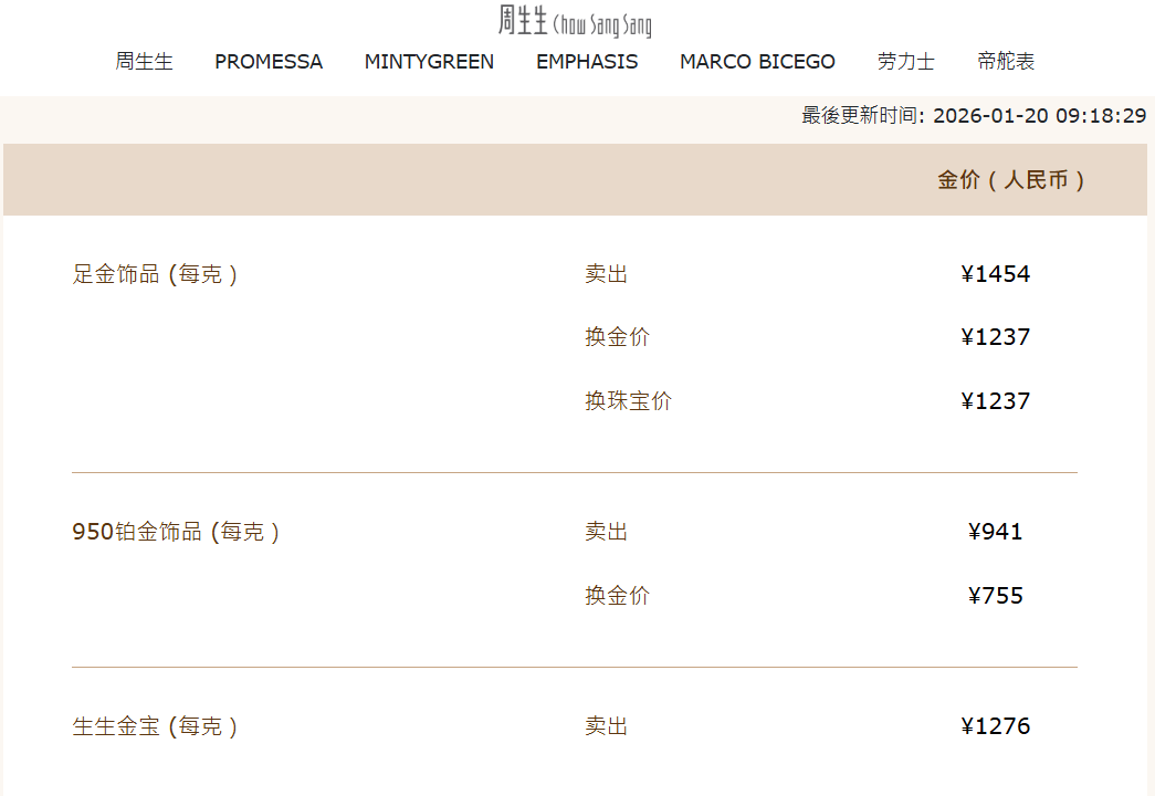 东吴期货20日报告称,近日贵金属震荡上行。一方面,美国宣称对欧洲国家加征关税,避险情绪再次升温利多贵金属;其次,鲍威尔遭到刑事起 诉,本质上看是美联储独立性再次遭到挑战,美元信用再遭打击;最后,上期所发布政策大幅降低沪银的交易限额至日内3000手,会挤出部分杠杆 投机资金,一定程度上抑制了短期投机需求。后续重点关注美联储主席人选,美欧关税对峙,南美及格陵兰岛的地缘影响等。 1月20日午后, 现货黄金突然直线拉升,历史首次站上4700美元/盎司。新年首月,现货黄金涨幅已超8%,涨逾380美元。 本周,国内金饰价格持续上涨,多品牌金饰克价站上1450元。 中新经纬查询发现,20日,周生生报价1454元/克,两日上涨25元;老凤祥报价1456元/ 克;老庙黄金报价1455元/克。 | | | 周生生 (how Sang Sang | | | | | --- | --- | --- | --- | --- | --- | | 周生生 PROMESSA | MINTYGREEN | EMPHASIS | MARCO BICEGO | 劳力士 | 帝舵表 | | | | | | 最後更新时间: 2026-01-20 09 ...