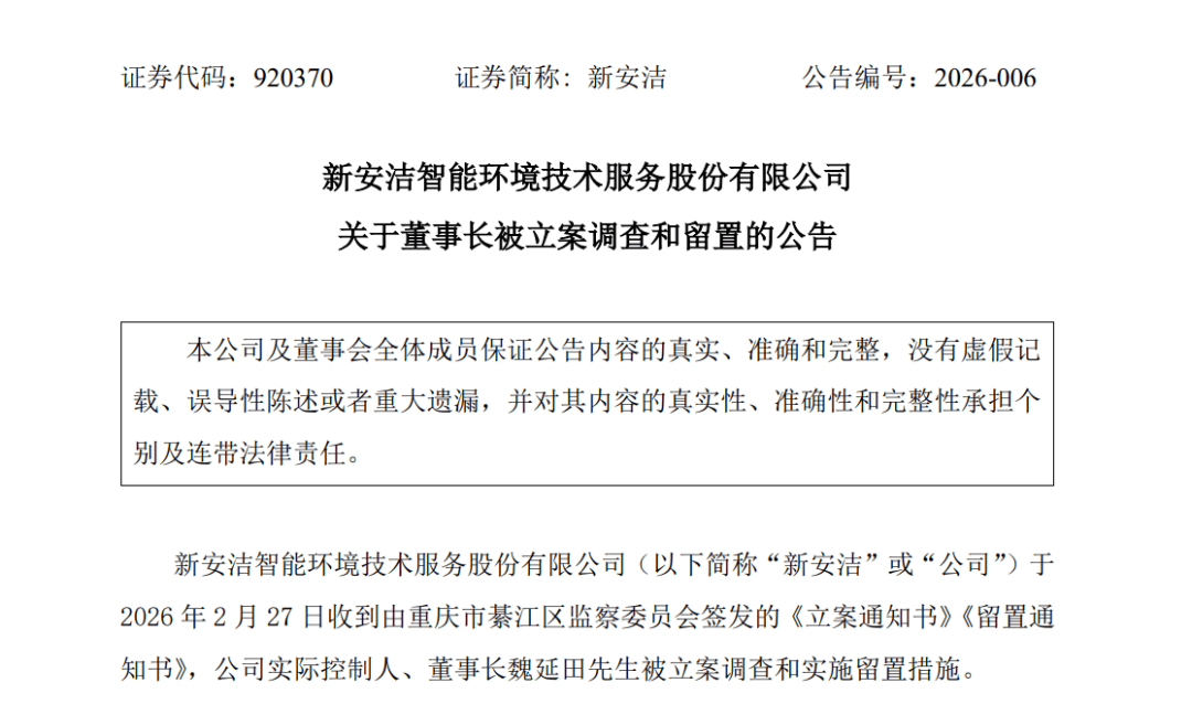 近日,新安洁披露2025年年度业绩快报显示,2025年,公司营业收入为3.95亿元,同比下降15.73%;归属于上市公司股东的净利润为亏损6816万元。 | 项目 | 本报告期 | 上年同期 | 变动比例% | | --- | --- | --- | --- | | 营业收入 | 395.436.666.86 | 469,267,450.27 | -15.73% | | 利润总额 | -76.437.706.09 | -57.309.983.73 | -33.38% | | 归属于上市公司股 | -68,162,273.49 | -53.433.885.96 | -27.56% | | 东的净利润 | | | | | 归属于上市公司股 | -71,001,960.49 | -41.345.285.18 | -71.73% | | 东的扣除非经常性 | | | | | 损益的净利润 | | | | 作者:蒋烨欢 新安洁表示,截至本公告披露日,公司未收到相关机关的其它通知,未被要求协助调查。公司已对相关工作进行了妥善安排。除魏延田外,公司其他董 事、高级管理人员均正常履职。 截至本公告披露日,新安洁董事会运行正常 ...