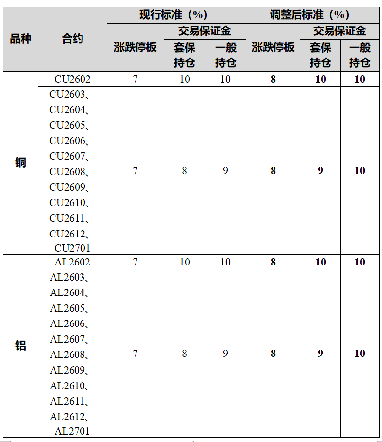 【大河财立方消息】1月20日,上海期货交易所发布关于调整铜等期货相关合约交易保证金比例和涨跌停板幅 度的通知。 黄金期货AU2602、AU2603、AU2604合约涨跌停板幅度调整为16%,套保持仓交易保证金比例调整为17%,一 般持仓交易保证金比例调整为18%; 黄金期货AU2606、AU2608、AU2610、AU2612、AU2702合约涨跌停板幅度调整为15%,套保持仓交易保证金 比例调整为16%,一般持仓交易保证金比例调整为17%; 白银期货AG2602、AG2603、AG2604合约涨跌停板幅度调整为17%,套保持仓交易保证金比例调整为18%,一 般持仓交易保证金比例调整为19%; 经研究决定,自2026年1月22日(星期四)收盘结算时起,交易保证金比例和涨跌停板幅度调整如下: 铜期货已上市合约的涨跌停板幅度调整为8%,套保持仓交易保证金比例调整为9%,一般持仓交易保证金比例 调整为10%; 铝期货已上市合约的涨跌停板幅度调整为8%,套保持仓交易保证金比例调整为9%,一般持仓交易保证金比例 调整为10%; 白银期货AG2605、AG2606、AG2607、AG2608、AG2609、AG2610、 ...
