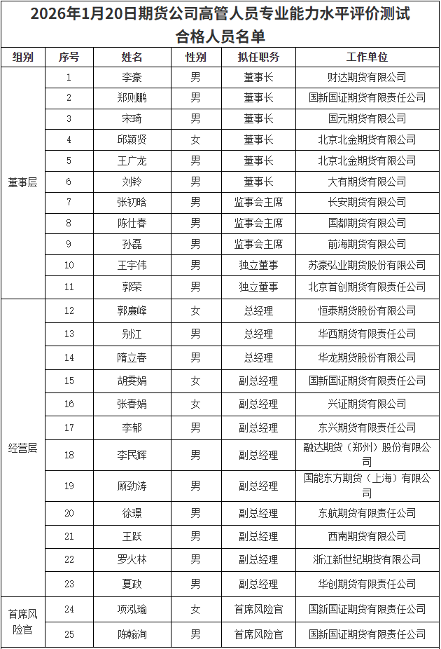 上证报中国证券网讯(记者 费天元)中国期货业协会最新发布"2026年1月20日期货公司高管人员专业 能力水平评价测试合格人员名单",财达期货拟任董事长李豪,国新国证期货拟任董事长郑则鹏,国元 期货拟任董事长宋琦,北京北金期货拟任董事长邱颖贤、王广龙,大有期货拟任董事长刘铃通过测试。 同时通过测试的还有恒泰期货拟任总经理郭廉峰、华西期货拟任总经理别江、华龙期货拟任总经理隋立 春。 中国期货业协会最新发布"2026年1月20日期货公司高管人员专业能力水平评价测试合格人员名单",财 达期货拟任董事长李豪,国新国证期货拟任董事长郑则鹏,国元期货拟任董事长宋琦,北京北金期货拟 任董事长邱颖贤、王广龙,大有期货拟任董事长刘铃通过测试。 | | | | 2026年1月20日期货公司高管人员专业能力水平评价测试 | | | | --- | --- | --- | --- | --- | --- | | | | | 合格人员名单 | | | | 细别 | 序号 | 姓名 | 性别 | 拟任服务 | 工作单位 | | | I | 李豪 | ਵੇਰੇ | 董事长 | 财达期货有限公司 | | | 2 | 美区则明 | ਵੇ | 重 ...