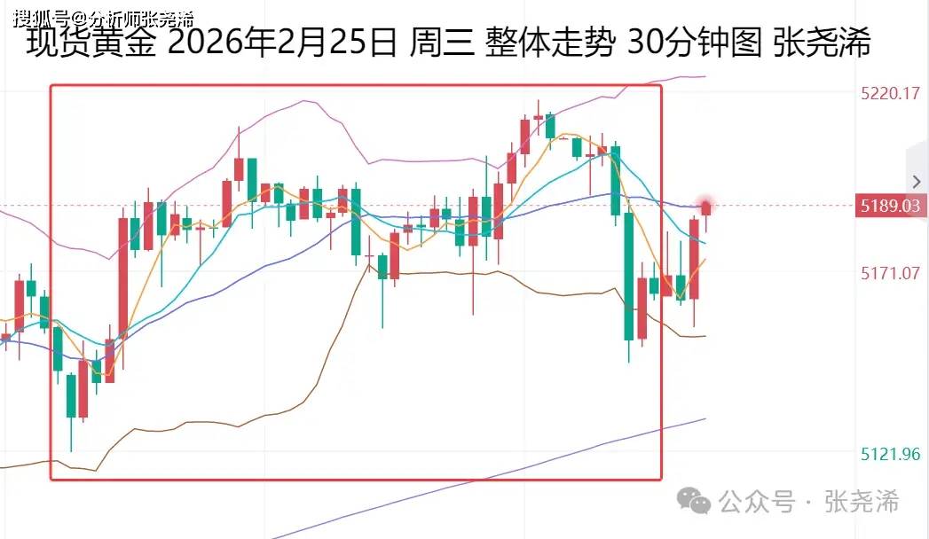 张尧浠:关税继续地缘风险仍在、金价走势前景仍看涨为主 上交易日周三(2月25日):国际黄金先涨后回撤,垂线收阳,未能持稳收复周二跌幅,使得短期走势仍面临震荡调整走低需求,不过下方均线支撑众多, 整体走势震荡上移,故此,如调整走低,下方触及各均线支撑位置,也是先行做多看涨为主。 具体走势上,金价自亚市开于5143.28美元/盎司,先行录得日内低点5120.96美元,之后反弹回升,并持续震荡波动,延续到美盘后时段,在录得日内高点 5217.39美元后,至盘尾又出现一波跳水,最终收于5165.06美元,日振幅96.43美元,收涨21.78美元,涨幅0.42%。 影响上,受到技术支撑买盘,以及本周与伊朗下一轮核谈判之前美国军事集结的紧张局势,伊朗仍追求核野心等支撑了金银价格。但由于美国短期维持利 率不变的前景可能会给黄金带来阻力。加上随着风险偏好回暖、股市上涨削弱了避险资产的需求,美国国债收益率延续涨势,限制了金价多头,使其最终 回撤收线。 展望今日周四(2月26日):国际黄金开盘先行走强,继续受到5日均线支撑的买盘推动,以及美国贸易政策缺乏明确性,美国贸易代表格里尔表示美国将对 15%的关税发布公告。关税继续实施。 ...