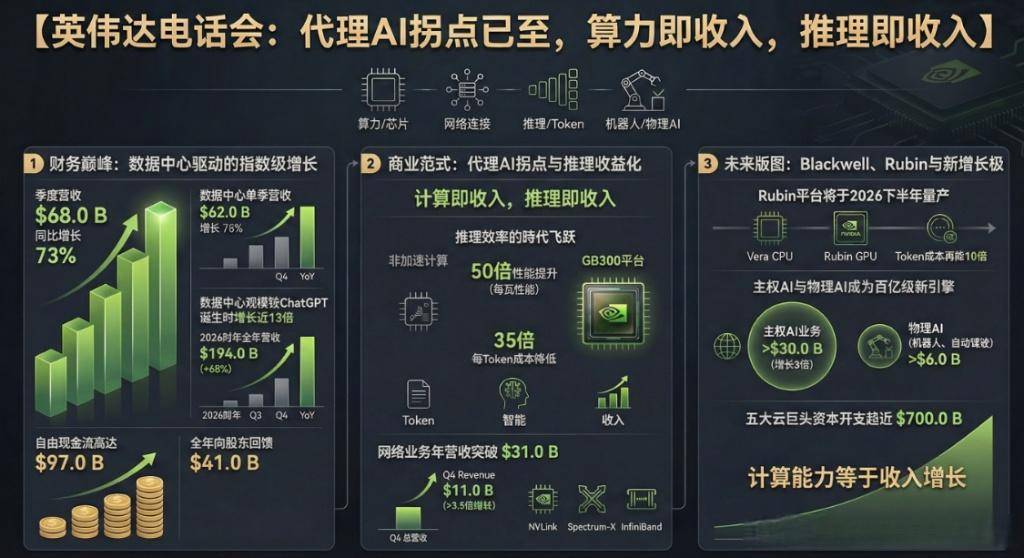 【英伟达电话会:黄仁勋高呼代理AI拐点已至,"推理即收入",当前的太空数据中心经济还是"贫瘠的"】英伟达CEO黄仁勋在电话会上直言,代 理AI(Agentic AI)已达到拐点,算力直接转化为收入。黄仁勋认为没有算力就无法生成token,没有token就无法实现营收增长,云服务商的巨额 资本开支最终将直接转化为收入。此外,公司证实接近达成与OpenAI的巨额基建合作,订单需求已排至2027年。 ...