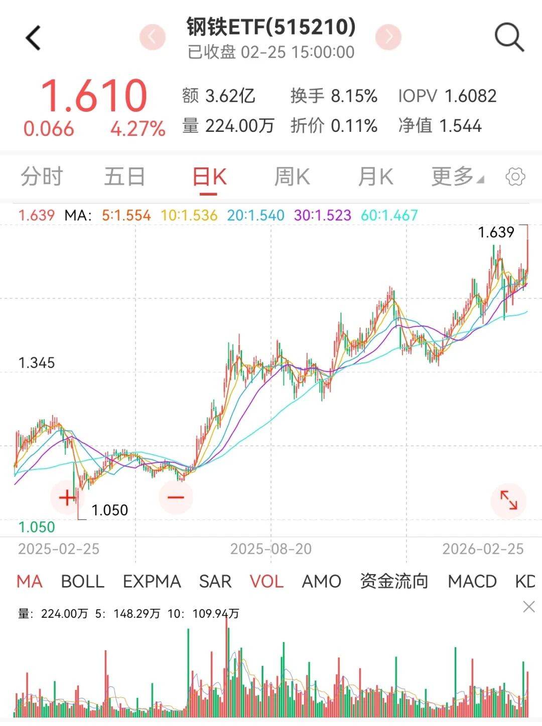 2月25日,钢铁ETF(515210)大涨4.27%。 来源:WIND 钢铁板块大涨,主要受供需两端的催化。需求侧,重点城市地产政策利好有望出台,夯实需求预期。 供给侧,2026年有收缩预期,铁矿有让利空间;预计行业将加速进入优胜劣汰阶段。2月8日,工信部发布了《钢铁行业规范条件(2025年版)》,文件属 于钢铁行业行业规范,属于偏职能性的引导文件;2月25日下午,工信部公示符合《钢铁行业规范条件(2025年版)》的首批企业名单。预计相关部门将 持续推进钢铁企业分级分类管理,全面开展钢铁企业分类评价,按照引领型规范企业、规范企业、不符合规范条件企业实施三级管理,引导资源要素向优 势企业集聚。且即将进入两会前后政策密集期,供给受限的概率加大。 当前钢铁板块或是弹性大且有预期差的底部板块。经历四年下行期后,产业的预期较低,今年冬储累库力度为近年来最弱,五大钢材总库存高度也处于近 年低位,映射产业心态上的谨慎和悲观。底部或意味着价格的调整较为充分,低库存水平下如果供需有催化,钢价或具备向上弹性。近期海外东南亚钢价 连续上涨,已经映射出一定的积极信号。投资者可以关注市场上唯一的钢铁ETF(515210)。 板块/基金 ...
