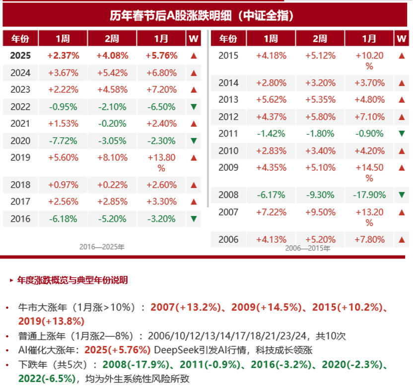 春节后红包行情持续。我们统计2006—2025年历史数据进行复盘,发现: 节后红包行情的胜率比较突出:20次春节,节后1周胜率16/21(76%)、2周同为76%,1月胜率71%(15/21),显著 高于全年平均约52%。5次下跌均为外生系统性冲击,非节日效应本身失效。 节后红包行情的涨幅可观:1周均涨+1.6%、2周+2.5%、1月+4.6%;牛市年(2007/09/15/19)1月均涨超13%;2025年 节后AI科技行情推动大涨,1周+2.37%、1月+5.76%,节后效应再度验证。 | | | | | 历年春节后A股涨跌明细(中证全指) | | | | | | | --- | --- | --- | --- | --- | --- | --- | --- | --- | --- | | स्टेसि | 1周 | 2周 | 1月 | W | स्टेसि | 1周 | 2周 | 1月 | W | | 2025 | +2.37% | +4.08% | +5.76% | 1 | 2015 | +4.18% | +5.12% | +10.20 | A | | 2024 | +3.67% | +5.42% | ...