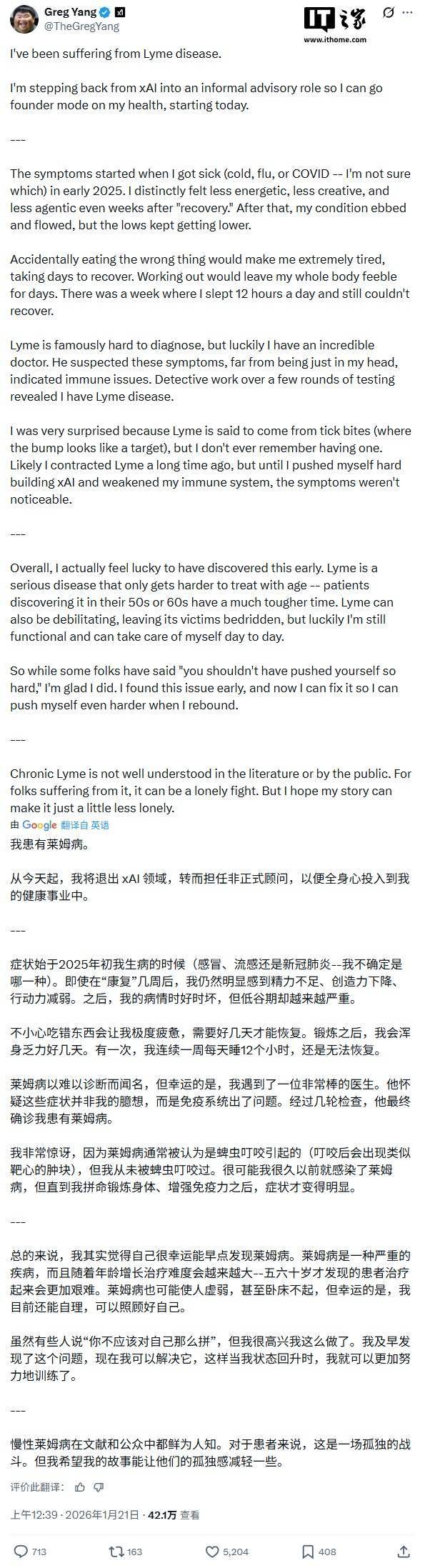 IT之家 1 月 21 日消息,当地时间周二,马斯克旗下 AI 初创公司 xAI 的联合创始人杨格在 X 上表示,自己被诊断出患有莱姆病,故决定从公司离职,不过 他同时还将担任 xAI 的非正式顾问。 IT之家注:莱姆病是一种由受感染的蜱虫叮咬而传播的细菌性疾病,主要由伯氏疏螺旋体引起,早期症状包括发烧、头痛和特征性的"牛眼状"皮疹,若不及 时治疗,可侵犯关节、心脏和神经系统。 另外,2025 年至少还有两位 xAI 联合创始人离开了这家公司,分别是伊戈尔 · 巴布什金 (Igor Babuschkin) 和克里斯蒂安 · 塞格迪 (Christian Szegedy)。 资料显示,杨格是 AI 科学家,出生于湖南,在广州上幼儿园,在北京上小学,在得克萨斯州休斯顿上中学,在马里兰州蒙哥马利县上高中。 杨格本科及硕士均毕业于哈佛大学数学系,师从丘成桐教授,于 2018 年毕业,曾在微软研究院担任研究员。2023 年,杨格成为 xAI 创始团队成员之一。 杨格表示,他很可能很久以前就感染了莱姆病,但直到在开发 xAI 期间高强度工作导致免疫系统减弱后才开始出现症状,尽管他早已不记得自己曾被蜱虫 叮咬过。 ...