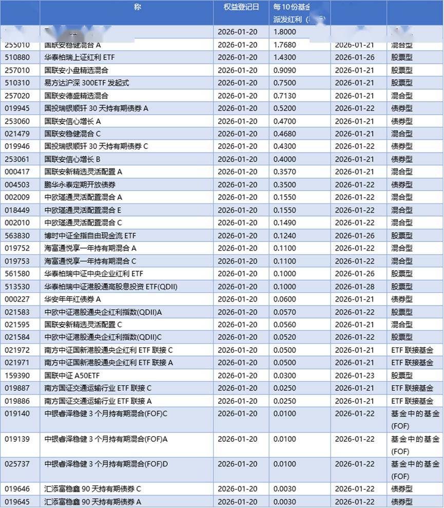 数据显示,截至1月20日,QDII基金总规模达9700亿元,较去年同期大增59%,距离万亿关口仅一步之遥,占全市场基金比 重升至2.6%。全球资产配置需求升温、美股及亚太市场赚钱效应显现,叠加美元强势预期,推动资金借道QDII"出海";尽 管体量仍低于股票、债券等主流品种,但跨境投资潜力持续释放,后续额度扩容与新品落地有望进一步提速。 1月20日,A股三大股指高开低走,探底后震荡回升,截止收盘,沪指跌0.01%,报4113.65点,深成指跌0.97%,报14155.63点,创业板指 跌1.79%,报3277.98点,科创50指数跌1.58%,报1482.99点。沪深两市成交额2.78万亿,全市场超3100只个股下跌。 二、基金要闻 一、交易提示 | | 标 | 权益登记日 | 每10份整 | | | | --- | --- | --- | --- | --- | --- | | | | | 派发红利( | 0 | | | | 28 | 2026-01-20 | 1.8000 | | | | 255010 | 国际安稳健混合 A | 2026-01-20 | 1.7680 | 2026-01-21 | 常见照 ...