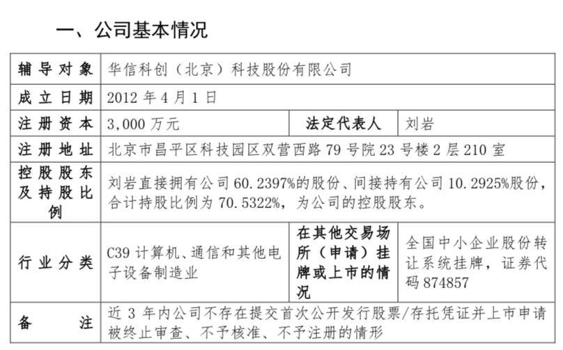 瑞财经 严明会近日,华信科创(北京)科技股份有限公司(以下简称:华信科创)在北京证监局完成IPO辅导备案, 辅导机构国联民生证券。 1月4日,华信科创公告,任命闫会娴为公司副总经理。 | 辅导对象 | 华信科创(北京)科技股份有限公司 | | | --- | --- | --- | | 成立日期 | 2012年4月1日 | | | 注册资本 | 法定代表人 3.000 万元 | 刘岩 | | 注册地址 | 北京市昌平区科技园区双营西路 79 号院 23 号楼 2 层 210 室 | | | 控 股 股 东 及持股比 | 刘岩直接拥有公司60.2397%的股份、间接持有公司 10.2925%股份, | | | 例 | 合计持股比例为70.5322%,为公司的控股股东。 | | | 行业分类 | 在其他交易场 C39 计算机、通信和其他电 所(申请)挂 | 全国中小企业股份转 让系统挂牌,证券代 | | | 子设备制造业 牌或上市的情 | | | | স | 码 874857 | | 注 | 近3年内公司不存在提交首次公开发行股票/存托凭证并上市申请 | | | | 被终止审查、不予核准、不予注册的情形 | | ...