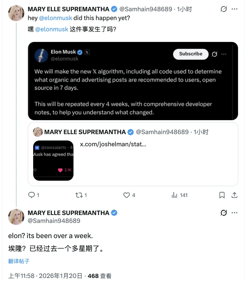 整理 | 屠敏 出品 | CSDN(ID:CSDNnews) "我们将在 7 天内把 X 平台最新的内容推荐算法开源。" 几天前,X 平台掌舵者埃隆·马斯克抛出的这句话,着实让不少人愣了一下。毕竟这意味着,外界将第一次有机会系统性地了解:X 到底是如何决定向用 户推荐哪些自然内容、哪些广告内容的。 彼时话一说出口,很多人翘首以盼,也在 X 上每天"蹲守",等着看马斯克会不会"爽约"。 让人有些兴奋的是,X 平台工程团队的 Engineering 官方账号于今天给出了答案。他们重磅宣布,正式开源新的 X 推荐算法——该算法采用了与 xAI 的 Grok 模型相同的 Transformer 架构。 与此同时,相关的 GitHub 仓库也一并公开:https://github.com/xai-org/x-algorithm ,上线六小时便已经获得了 1.6k 个 Star。 | xai-org /x-algorithm | Public | | Notifications | 2 Fork 283 | Star 1.6k | | --- | --- | --- | --- | --- | --- | | <> Co ...