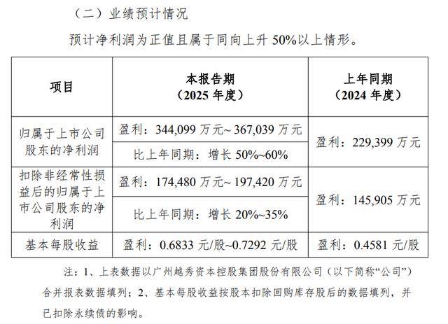越秀资本:预计2025年度归母净利润34.41亿元至36.7亿元,增长50%至60%
